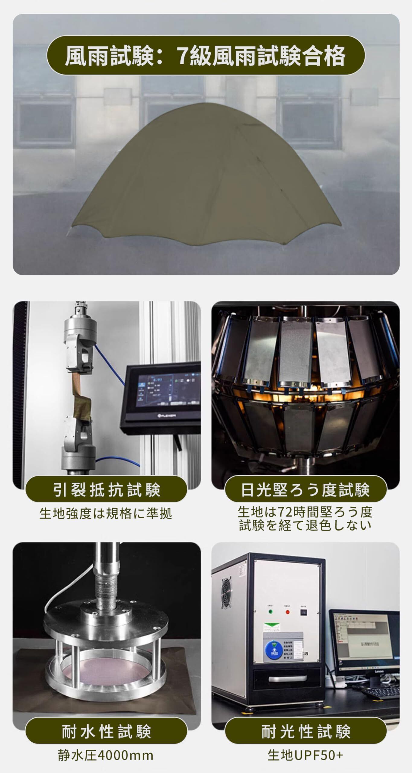 4000mmの耐水圧を誇り、そして撥水加工素材を採用しているため、雨天時でも安心してご使用いただけます。二重層構造により、より高い防風・防雨性能を実現しています。「※製品に関するご質問がございましたらお気軽にお問い合わせください。」