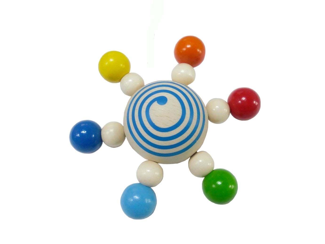 指でビーズをはじくと子どもでも簡単にコマが回せる。渦巻きがクルクルと回転しプレゼントにも喜ばれる。赤ちゃんの大好きなラトル。安全な塗料を使用しているので口にしても安全に使用できる。