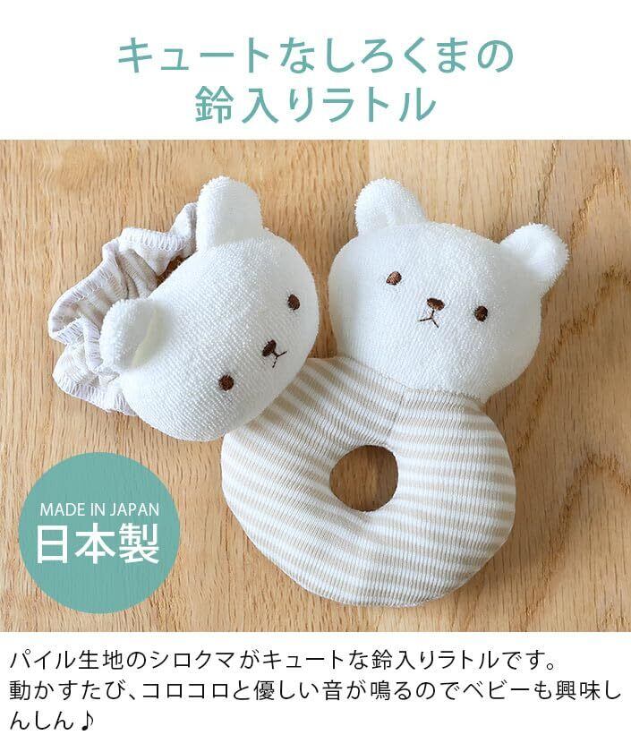 【キュートなしろくまの鈴入りラトル】パイル生地のシロクマがキュートな鈴入りラトルです。動かすたび、コロコロと優しい音が鳴るのでベビーも興味津々