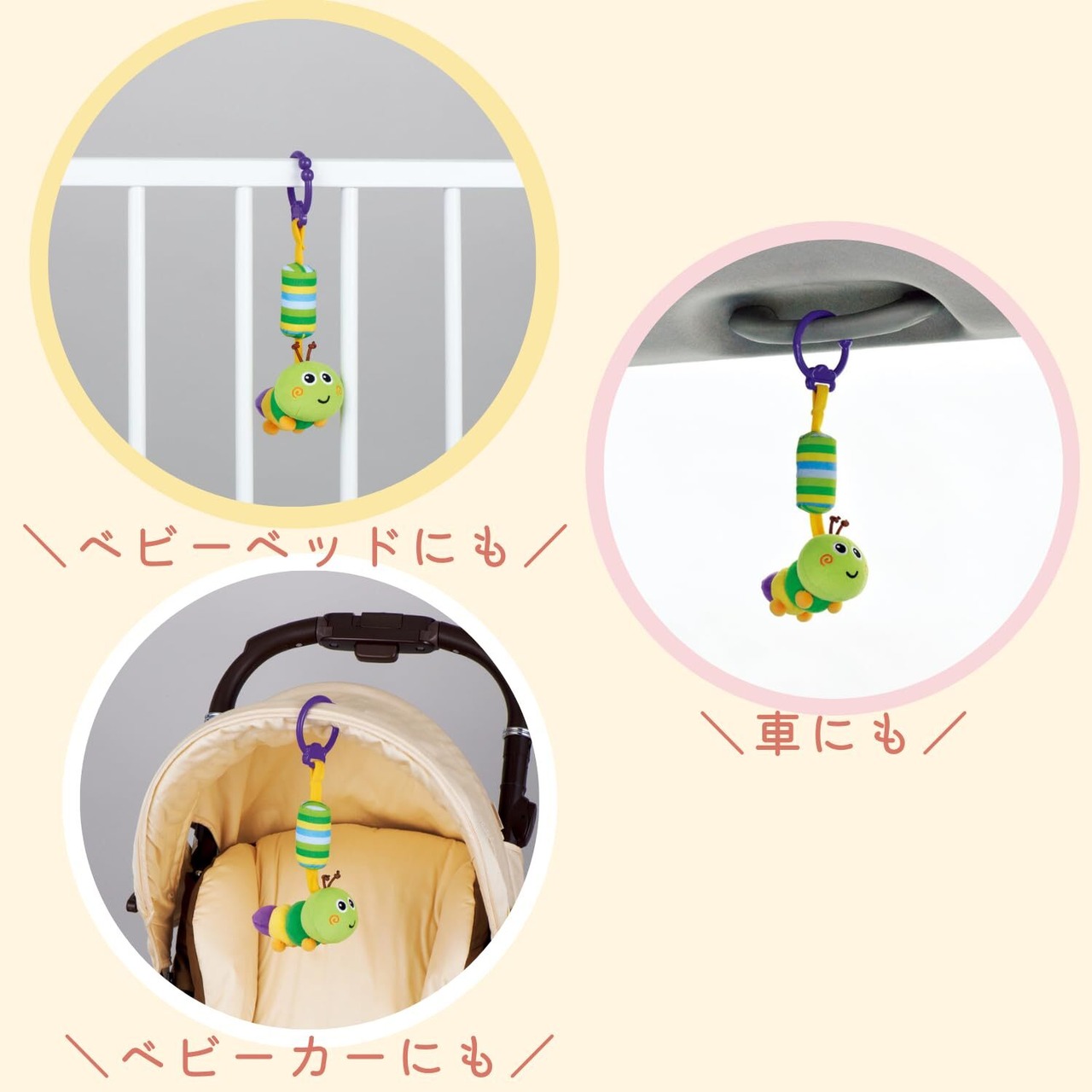 このベビーカートイは、車やベビーベッドに手軽に吊り下げることができます。出かける際も、簡単に取り外しができ、持ち運びにも便利です。お出かけを楽しくサポートします!