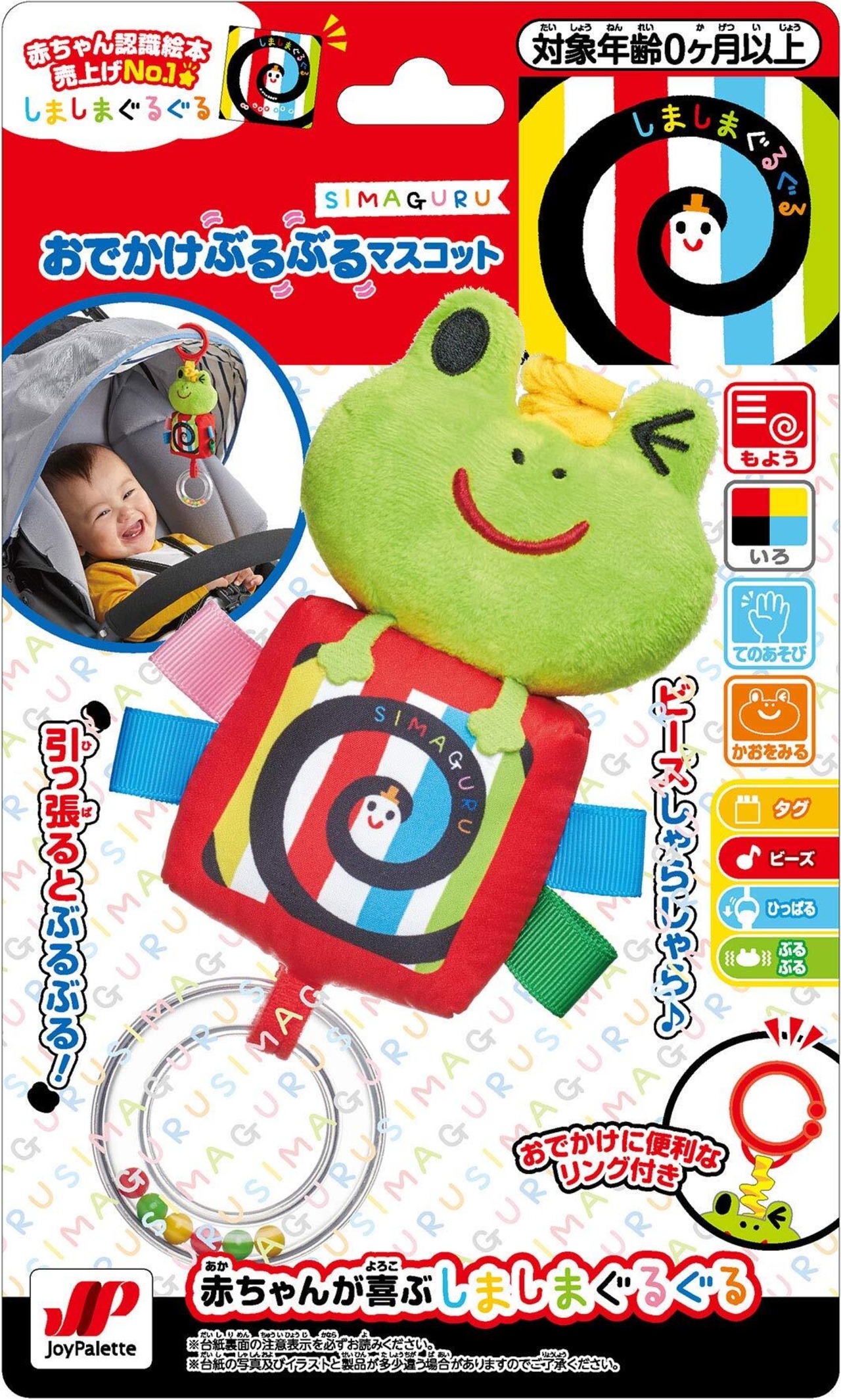 赤ちゃん認識絵本売り上げNo.1『しましまぐるぐる』のベビートイシリーズ!ひっぱるとぶるぶる動く!赤ちゃんとママのおでかけをサポートしてくれるかえるのマスコットです。本体を下にひっぱるとぶるぶるふるえながら上に戻るので赤ちゃんも興味深々!つまんで楽しいカラフルなタグは指先の発達を促します。ビーズ入りリングはゆらすとしゃらしゃら音が鳴ります。おでかけに便利なリング付き!ベビーカーに取り付けられます。