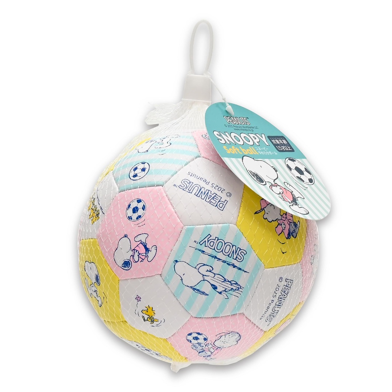 人気コミック“PEANUTS”の「スヌーピー」がデザインされたやわらかい布ボールです。いろいろなボール遊びをしたPEANUTSの仲間たちが優しい色合いで描かれています。