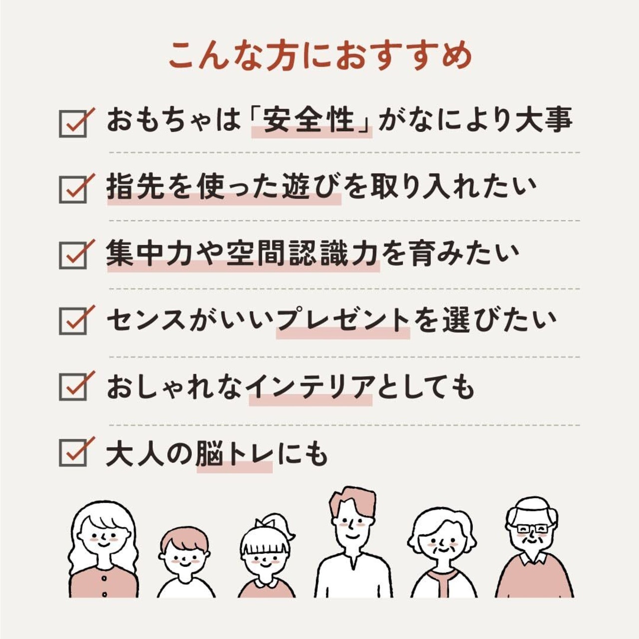 特徴: 知育効果、新構造の積み木、デザイン性に優れた商品