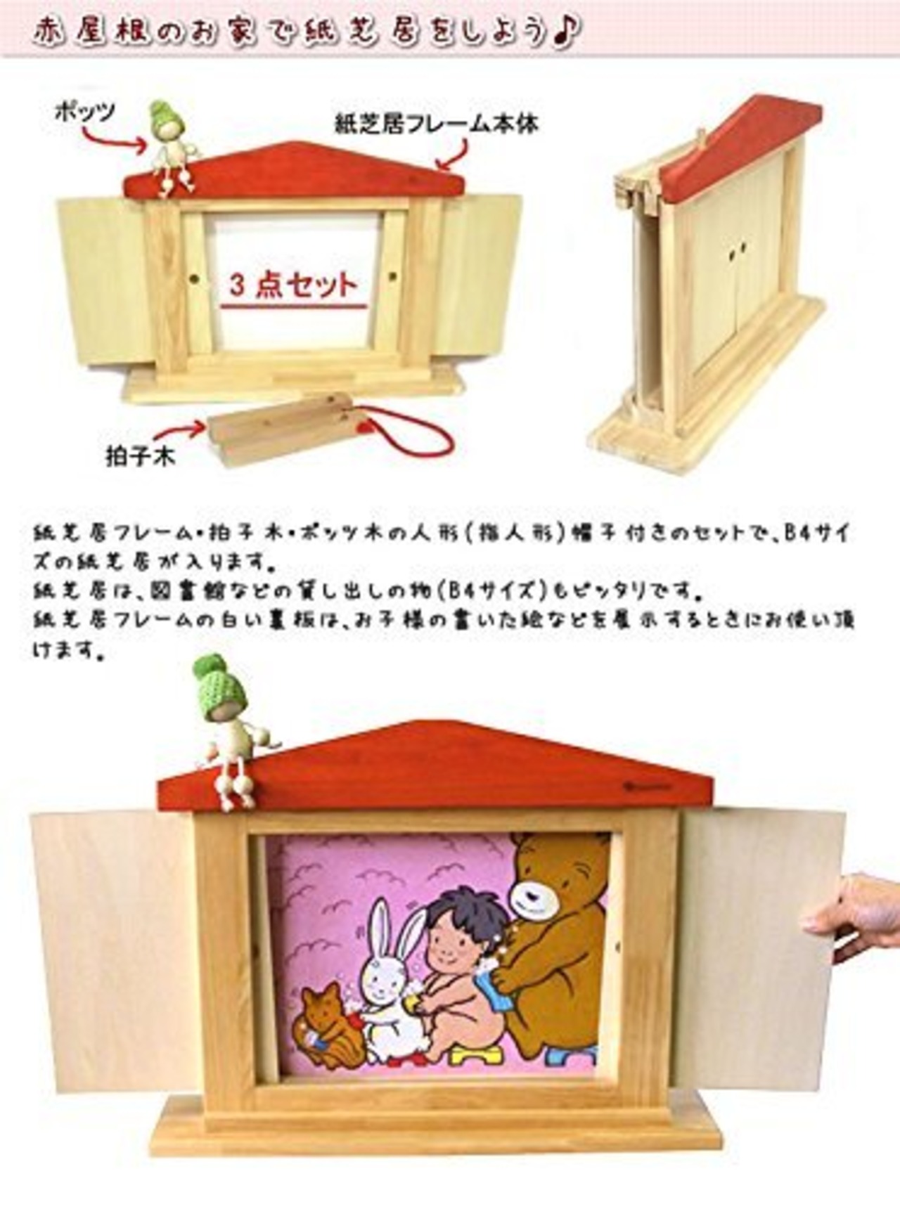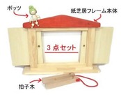 オリジナル紙芝居フレーム・拍子木・森の木の妖精「ポッツ」(木の指人形)帽子付きのセットです。