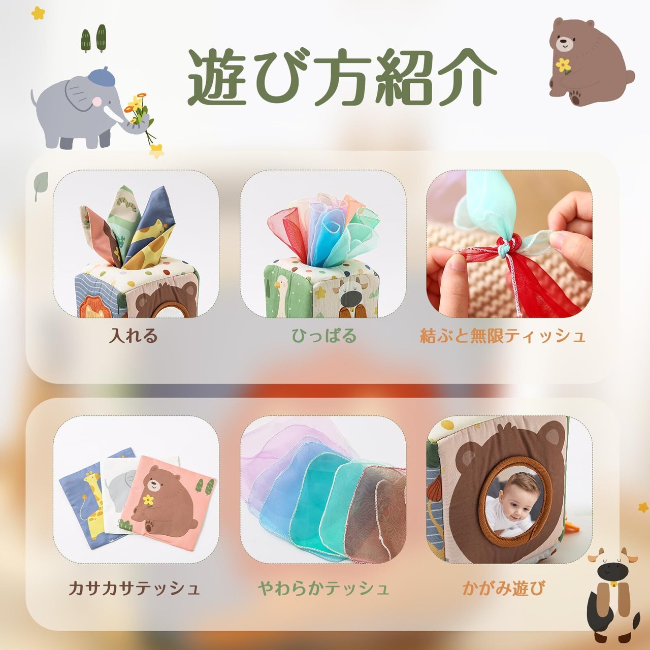 赤ちゃんがつかんだり、ひっぱったりすることで、手先の器用さや筋力を育むことができます。ティッシュのような遊びを通じて、探索心や好奇心を引き出し、楽しい遊びの中で自然と学びを深める素晴らしい機会を提供します。