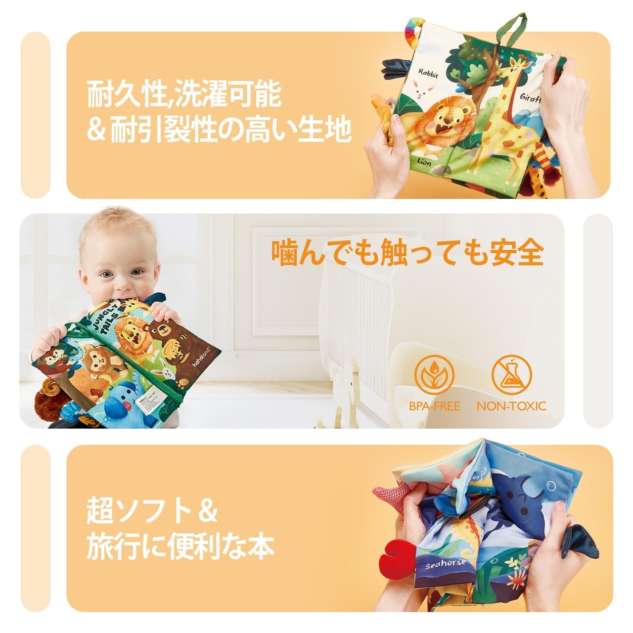 【赤ちゃんの素晴らしいお友達】2冊のベビーブック。1冊はジャングルのしっぽ、もう1冊は海洋生物について。合計20ページ。BPAフリーで、ほぼ布製で、触ったり噛んだりするのに柔らかく、赤ちゃんが怪我をすることなく簡単に使用できます。洗濯可能で、摩耗を防ぐために丈夫なステッチが施されています。明るいイラストが赤ちゃんの注意を引き、幼児は口に物を入れて周囲の世界を識別します。