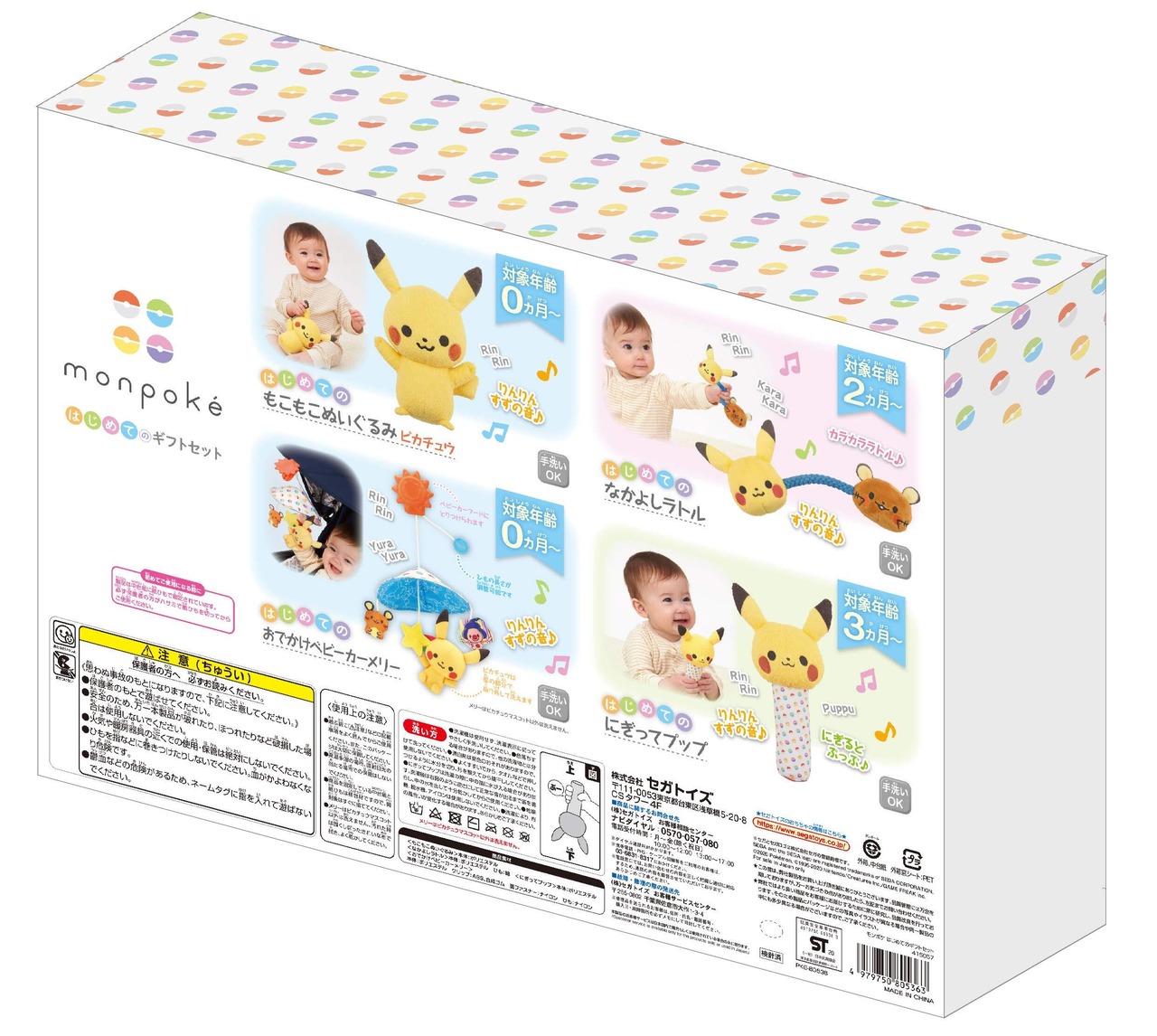 ギフトボックスの中には、もこもこぬいぐるみピカチュウ、なかよしラトル、にぎってプップ、おでかけベビーカーメリーの合計4アイテムのセットです。