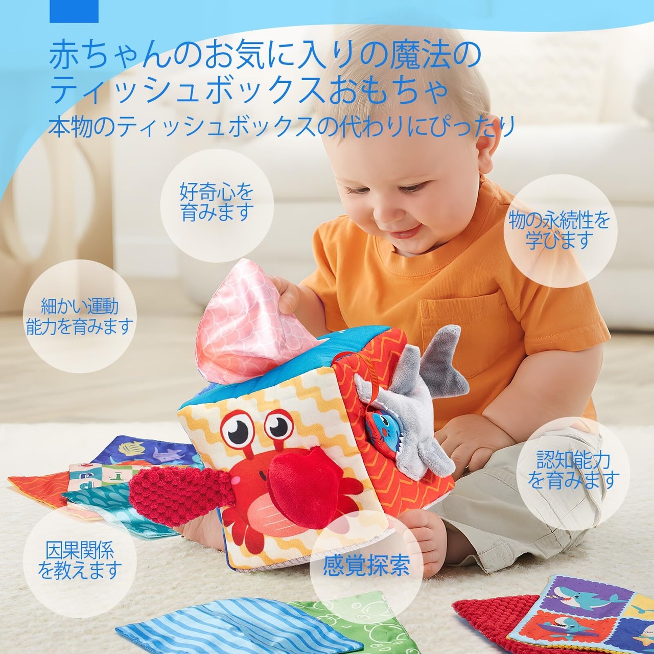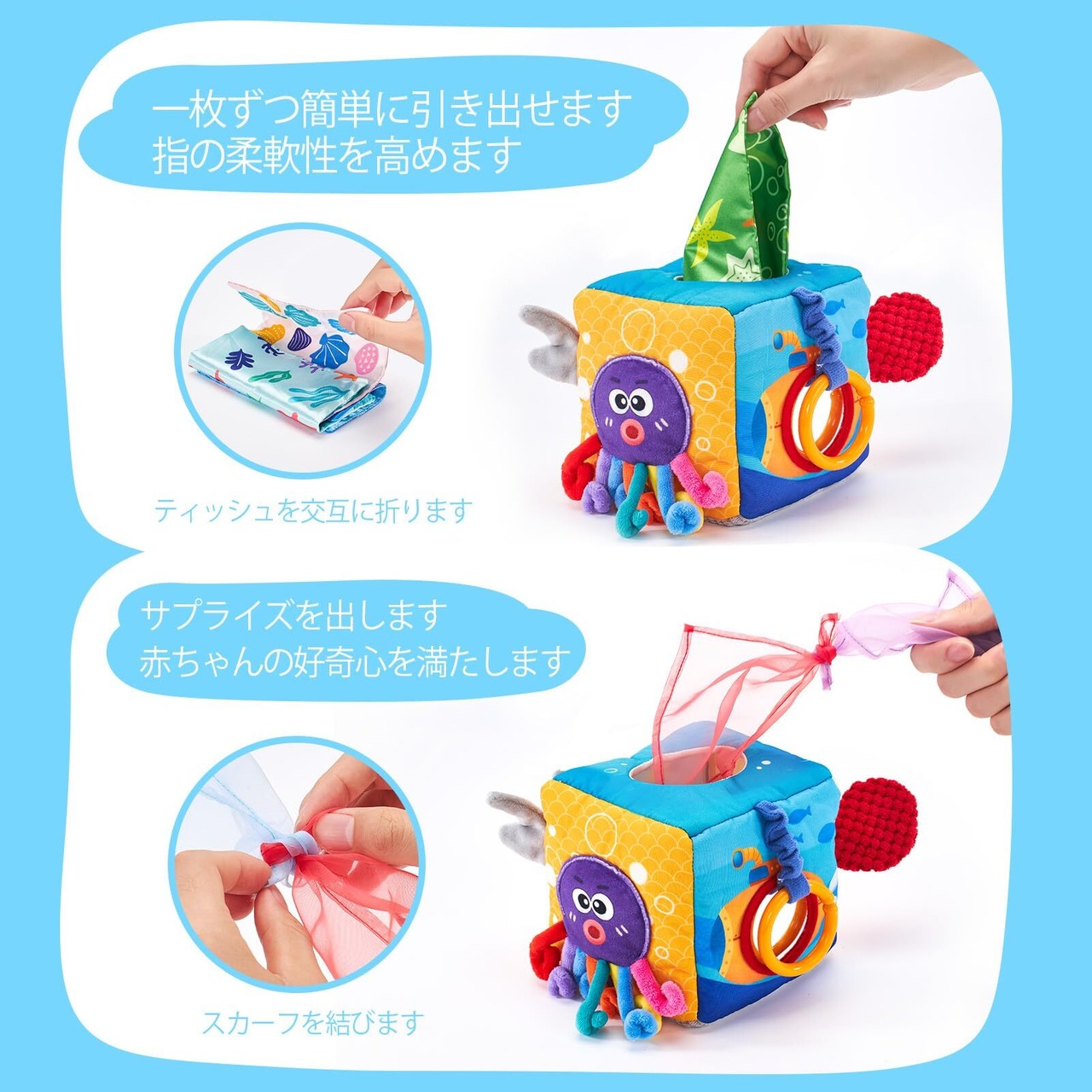 【細かい運動能力と好奇心を育みます】赤ちゃんがティッシュを1枚ずつ簡単に引き出せるように、様々な方法で探索することができます。このアクティビティは、細かい運動能力の発達を促し、好奇心を満たし、探索と発見を促します。さらに、シルクスカーフは結ぶことができ、お子様にサプライズをプレゼントします。
