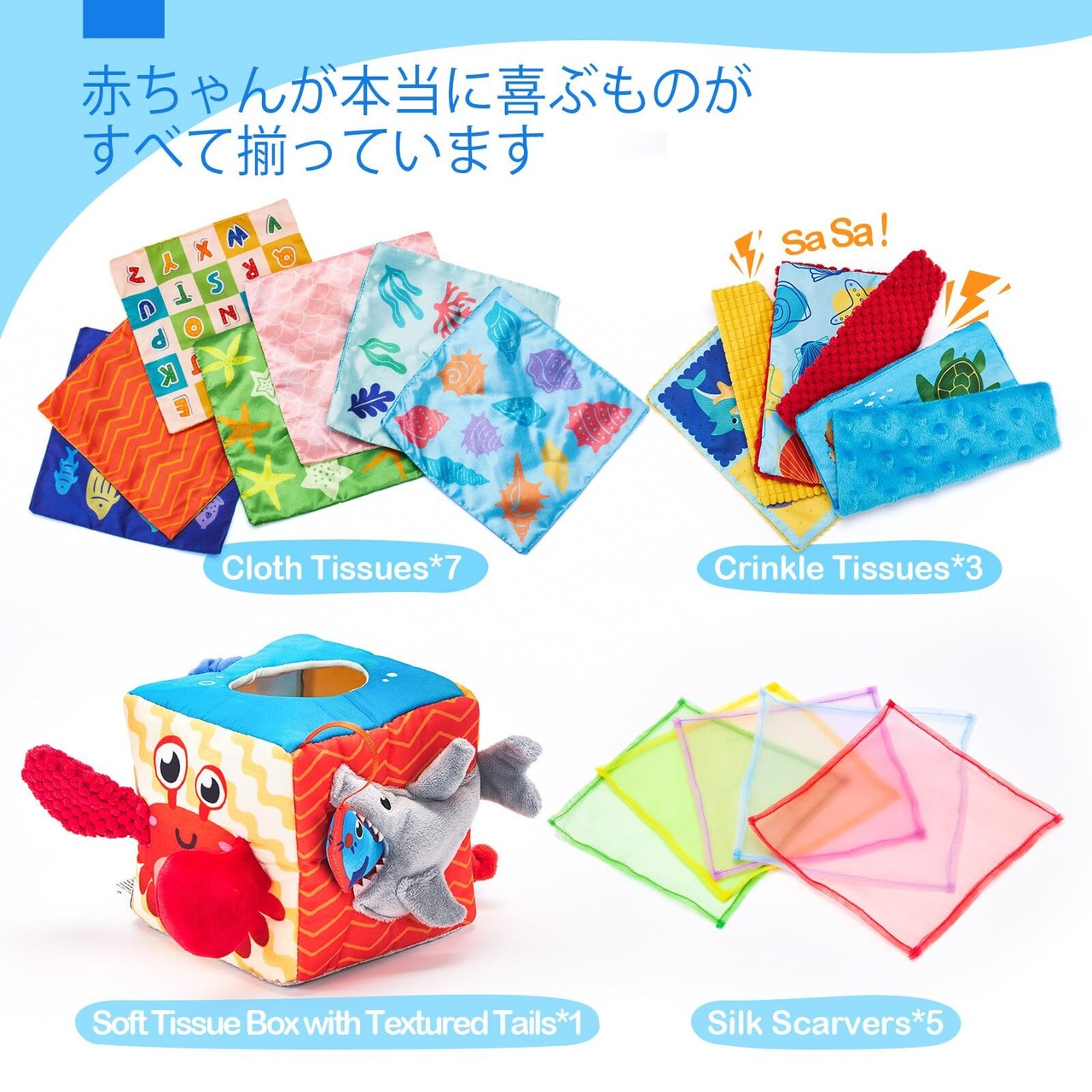 【赤ちゃんが本当に喜ぶものがすべて揃っています】このセットには、しっぽの質感が特徴のソフトティッシュボックス、6種類の異なる質感の布製ティッシュ、クリンクルティッシュ3枚、シルクスカーフ5枚が含まれています。様々な遊び方で赤ちゃんを楽しませ、6ヶ月以上の赤ちゃんへのプレゼントに最適なボックスパッケージです。