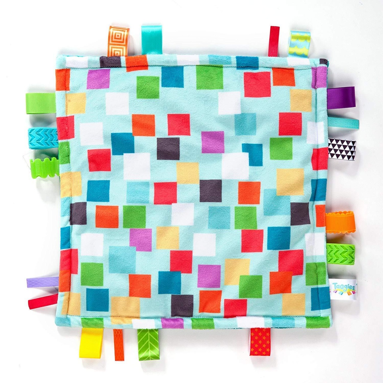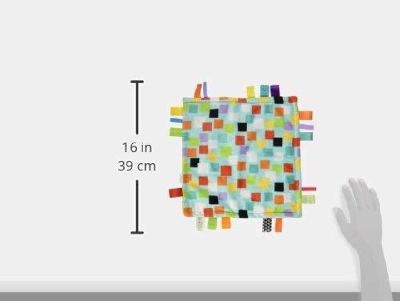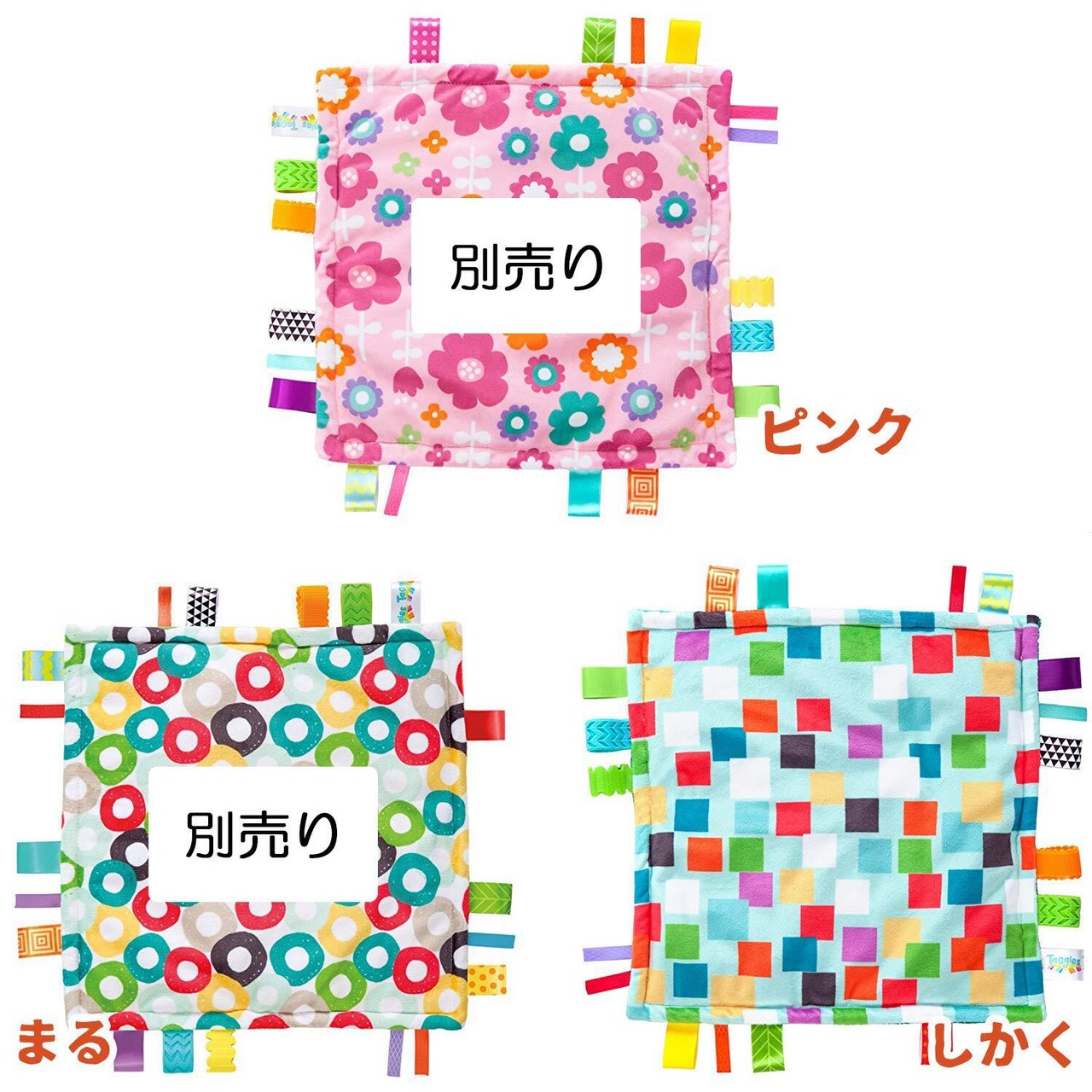 赤ちゃんの好きなサテンのタグが沢山ついています。タグにリングを通して、ベビーカーなどに取り付けることも可能です。