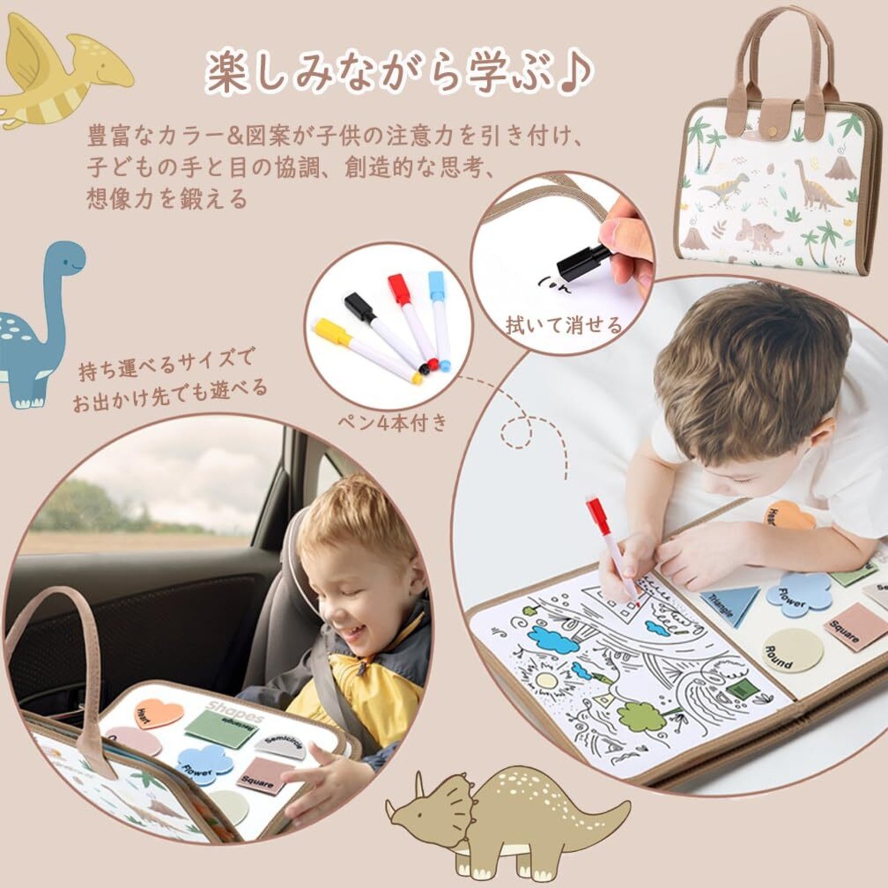 【モンテッソーリビジーボード】子供が大好きな恐竜がいっぱいのデザインです。内側にポケットもついていて、小さいものなど収納するのに便利