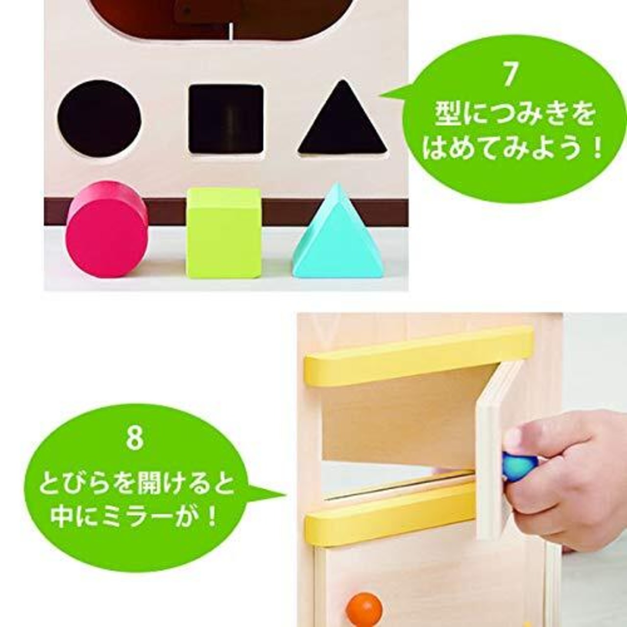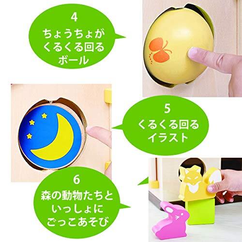 「えんとつあそび」「音あそび」「かぎあそび」「回転あそび」「とびらあそび」「ごっこあそび」「ボール」「ビーズコースター」「型はめ」「シロフォン」の10種の遊びができるかわいいおうちです。