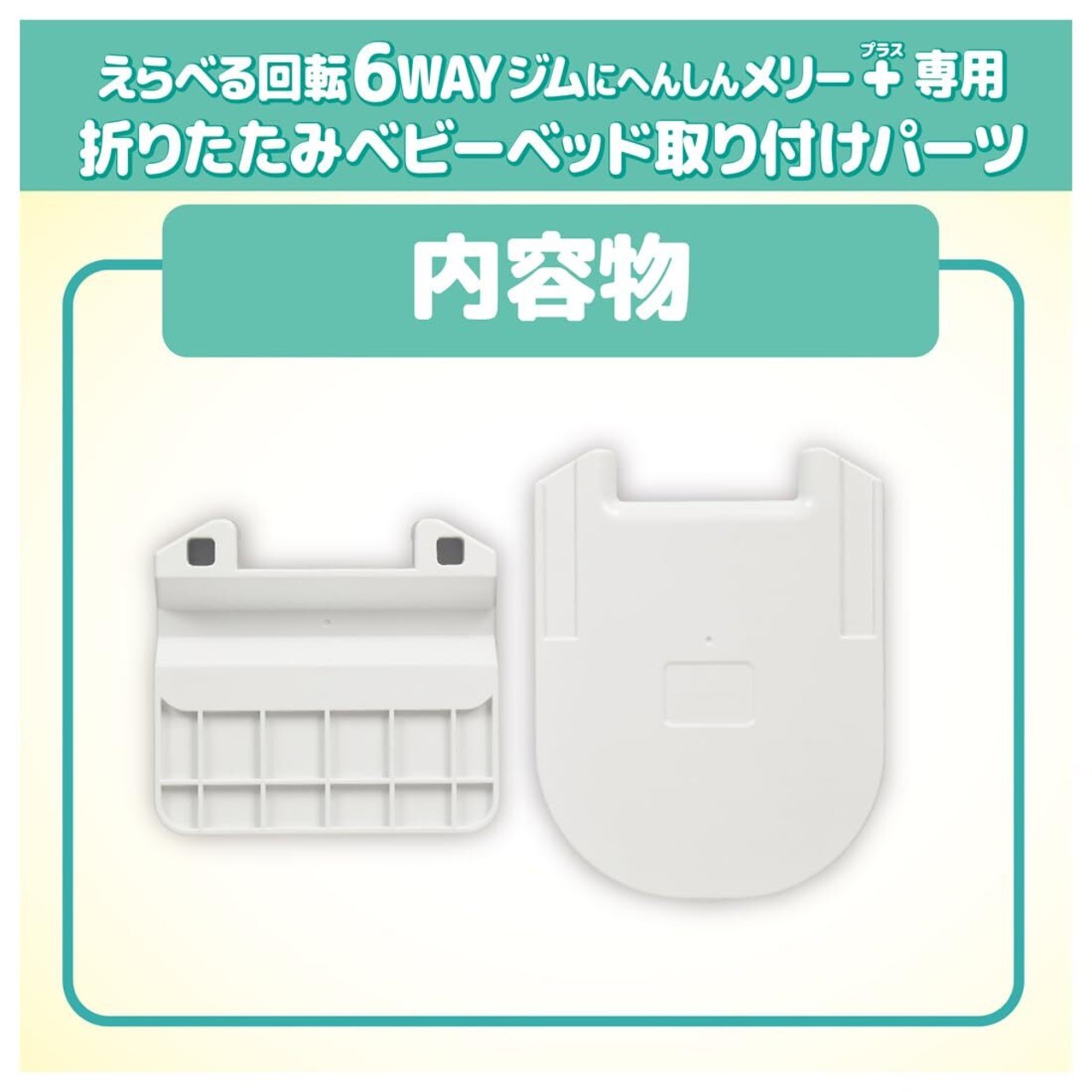 折りたたみベビーベッドの枠をこのパーツで挟み、その上からメリー本体を設置することで、折りたたみベビーベッドでも6WAYジムにへんしんメリープラスを使うことができます。