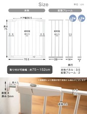 【サイズ】【本体パネル】幅70.5×奥行3.5×高さ75cm【拡張フレーム】幅7×奥行2×高さ73cm、幅14×奥行2×高さ73cm、幅28×奥行2×高さ73cm【取り付け可能幅】:75~152cm