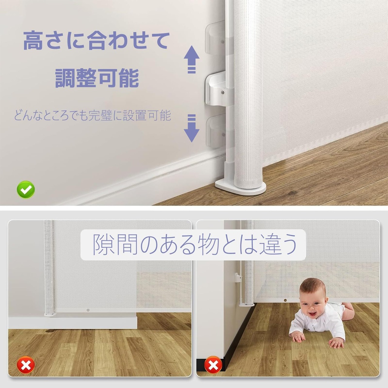 ❀❀様々なドア幅に対応:この100cm以上ロール式ベビーゲートは、使用しない時の収納に便利で場所を取りません。巻き取り式のデザインは、あらゆるサイズのドアフレーム(幅180CMまで)にフィットするので、ベビーエンクロージャーのサイズが合わないという心配はありません。フック接続とメッシュゲートのデザインにより、片手でメッシュゲートを開けることができます。赤ちゃんや幼児、猫や犬などの小さなペットがいるご家庭には、ベビーゲートがおすすめです。