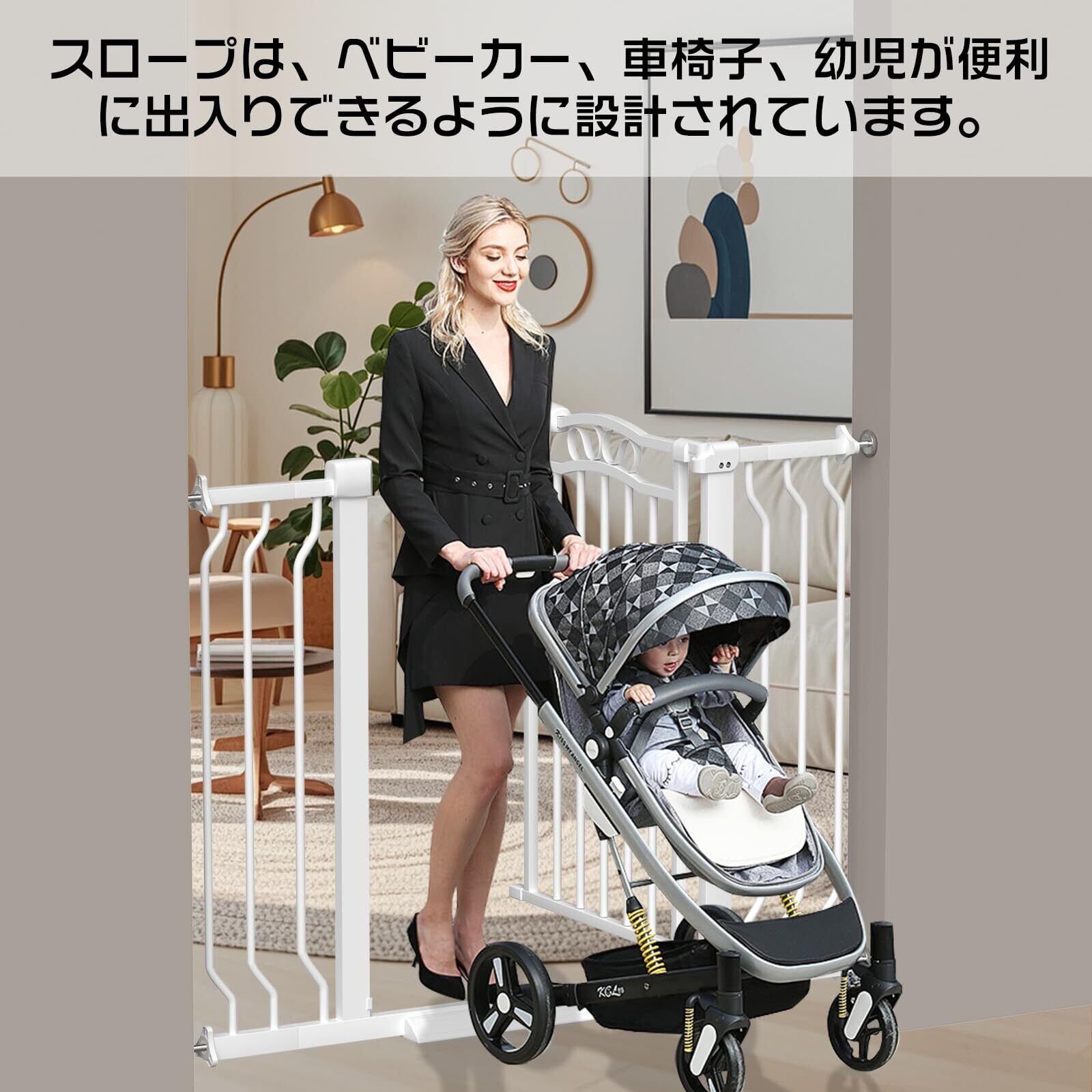 オートクローズと前後両開き:ベビーゲートはドアを90度以上開けるとその状態をキープし、90度未満の場合は手を離すと自動で閉まりロックもかかるオートクローズ機能を搭載しています。ベビーゲートは前後どちらからでも開閉でき、通行のストレスを軽減します。ベビーゲートを閉め忘れる心配もなく、自動で閉まりロックがかかることができます。