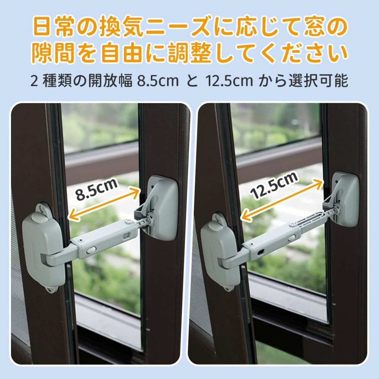 調整可能:本製品は2種類の開放幅8.5cm と 12.5cmから選択可能です。日常の換気ニーズに応じて窓の隙間を自由に調整できます。お子様やペットを保護しながら、換気ニーズを満たすことができます。