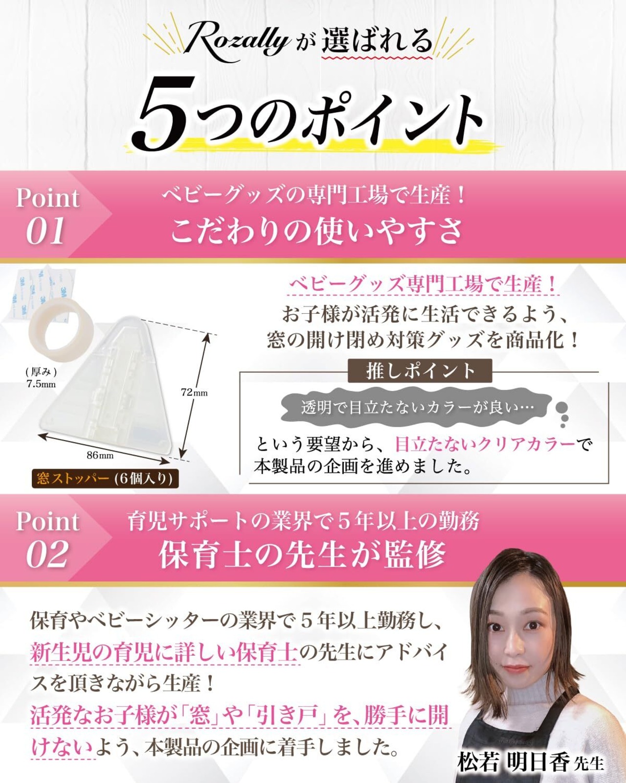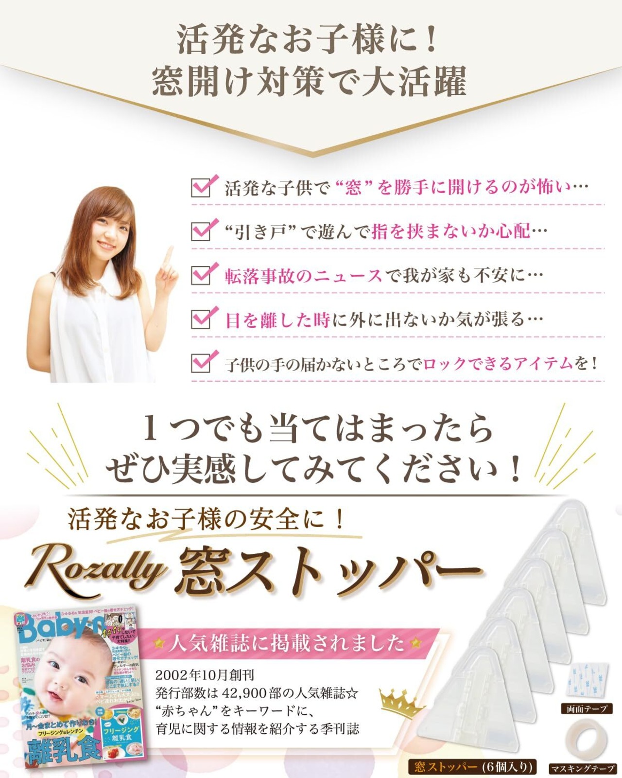 【保育士が監修】 Rozally 窓ストッパー がついに正式販売開始。 いたずら好きの 子供 が 窓 を開けて ベランダ に勝手に出ないように、ロック したい というお客様の声から生まれた 窓 ストッパー です。 窓ロック が可能なことがもちろん「 引き戸 / 扉 / ドア」 などに設置することで「いたずら防止」と「指はさみ防止」の両方の対策が可能です。 マスキングテープ が付属で 賃貸 でも 簡単に跡を残さず 剥がせる ため、 育児中によくある「指はさみ対策」や「いたずら対策」でお悩みのママさんに、 使いやすい ベビーガード として選ばれています。 企画&設計では 新生児 や 子供 の育児に詳しい【保育士】の先生からアドバイスをもらい、 ベランダからの「転落防止」「落下防止」を考え、設置方法をフルカラー説明書として添えて企画&開発しました。