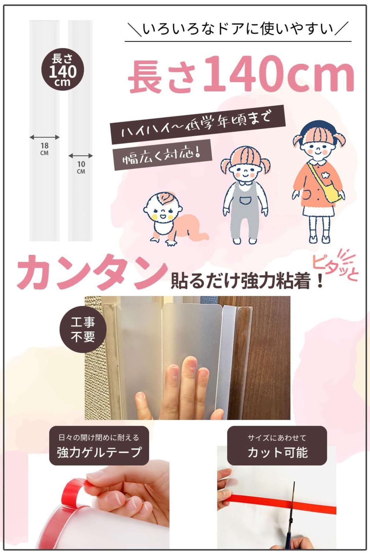 本製品は特別な工具を必要とせず、ドアや扉に簡単に取り付けることができます。2枚のセットになっており、必要な場所に合わせて使えるのが魅力です。「※この商品に関するご質問がございましたら、お気軽にお問い合わせください。」