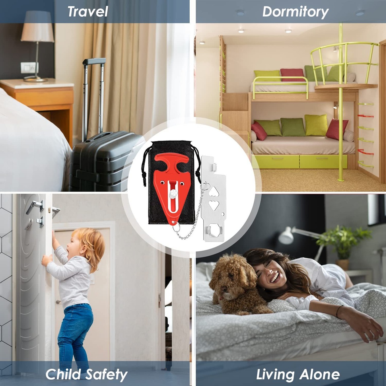 数秒で取り付け&取り外し - 工具なし:ドアロックセキュリティは工具なしで数秒で取り付けられ、ドリルや取り付けは必要ありません。 ドアジャムの穴に金属片を入れてドアを閉め、赤いハンドルを取り、ロックに挿入するだけで、外からドアを開けることはできません。 緊急事態や暗闇でも、数秒でロックを外すことができます。