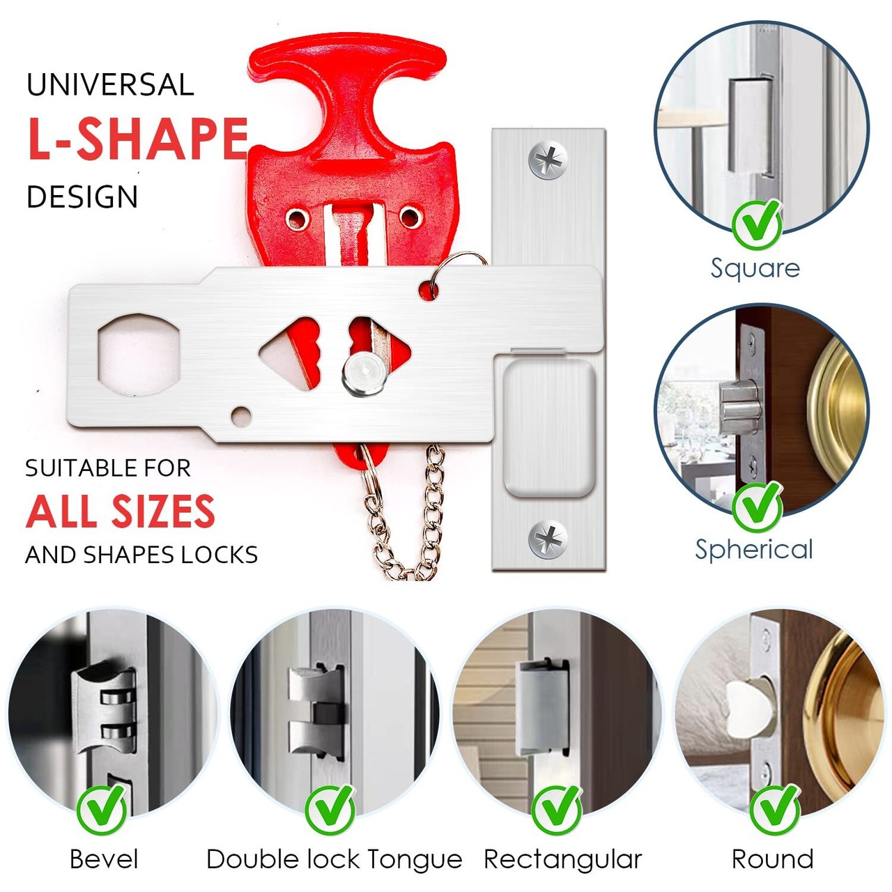 ユニバーサルL字型ポータブルドアロックをアップグレード:2つのサイズの穴しかない市販のポータブルドアロックの場合、ドアロックを使用するデッドボルトの長さと幅にサイズ制限があり、ほとんどのドアロックは適していません。 この問題に対応して、当社のポータブルドアロックは、すべてのドアロックに完璧にフィットし、さまざまな長さ、幅、形状のドアロックに適した新しいL字型デザインを採用しています。