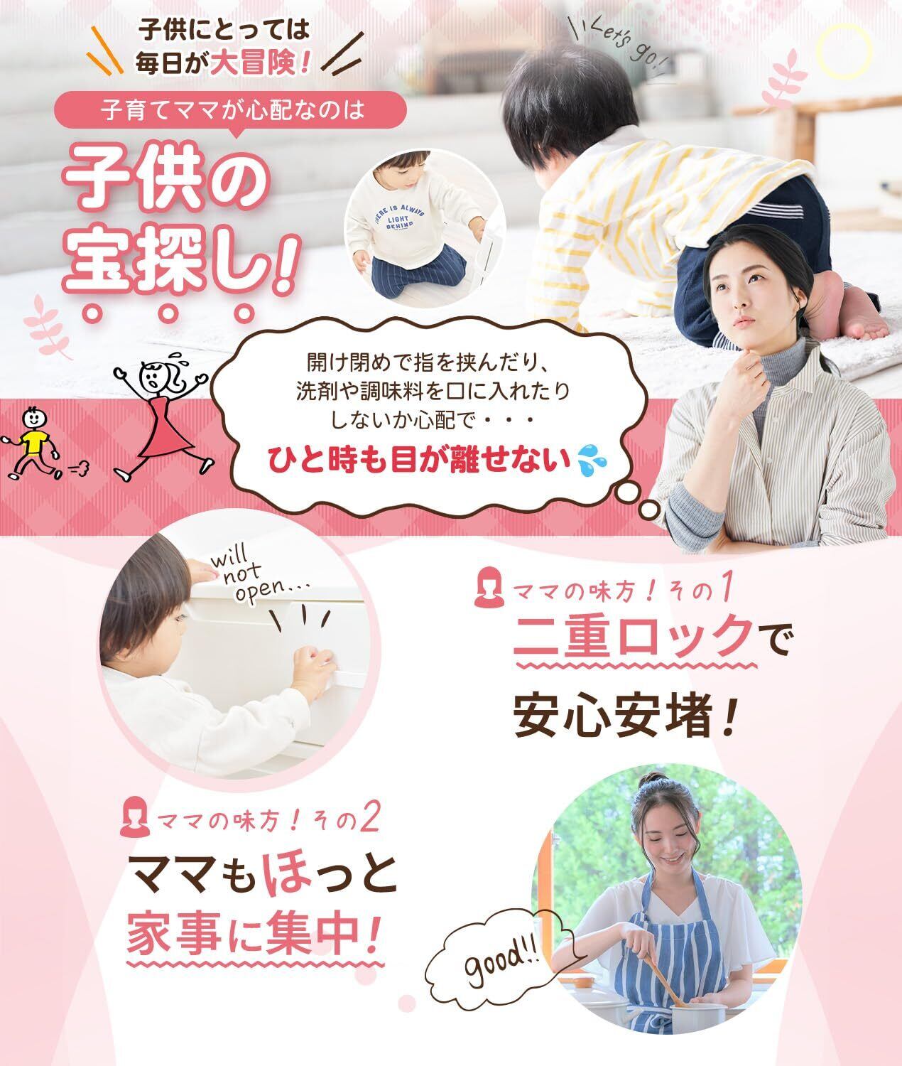 本製品は、しっかりとした2重ロック機能を搭載しており、お子様が誤って開けてしまうリスクを大幅に軽減します。簡単に取り付けられるため、家中の様々な場所で使用可能です。「※この商品に関するご質問がございましたら、お気軽にお問い合わせください。」