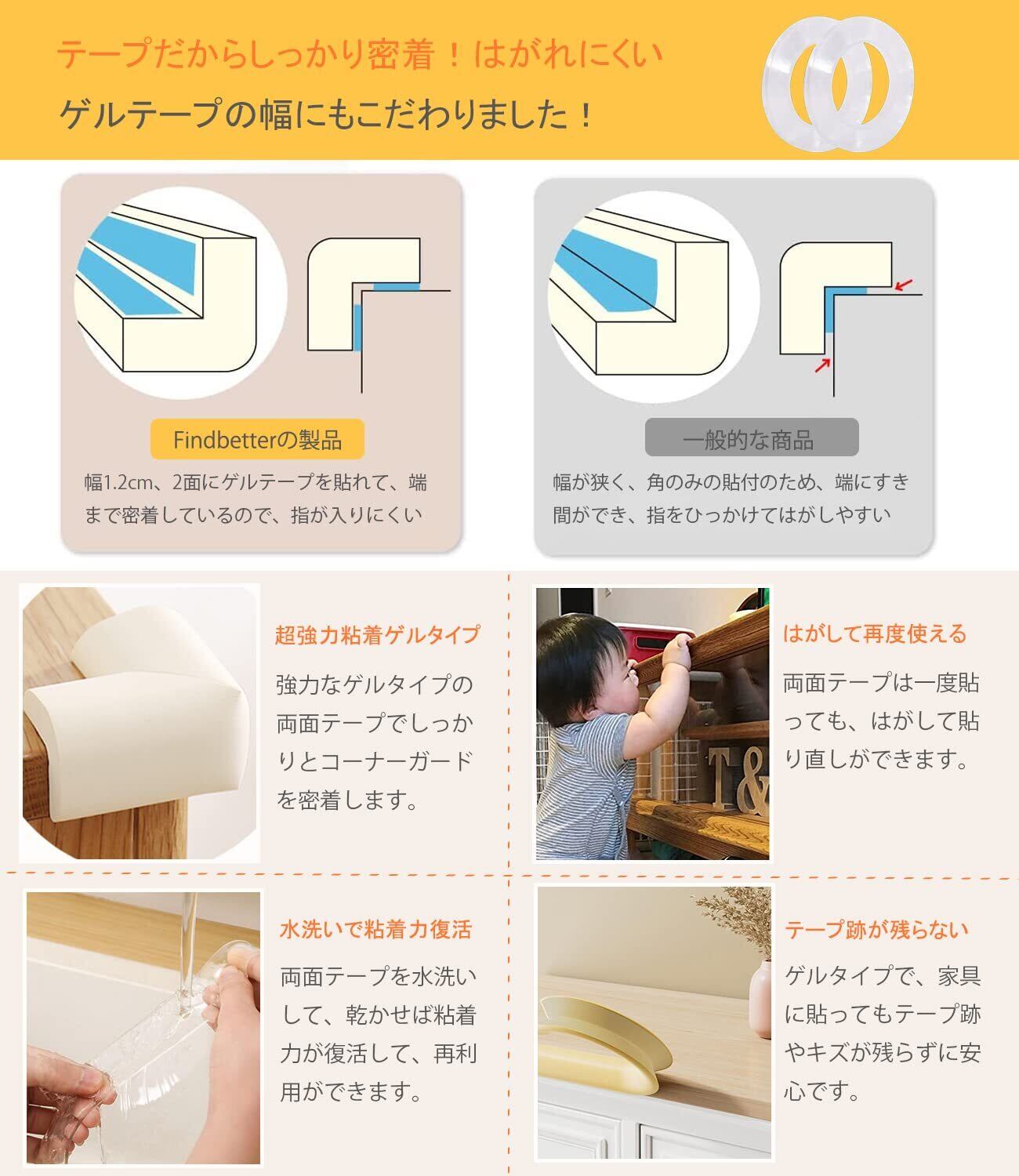 Findbetterのコーナーガードは強粘着のゲルテープを貼りしろ両面に貼れるダブルテープ仕様で、ゲルテープが対象物に隙間なくしっかり密着!赤ちゃんの手が入り込まず剥がしにくい!