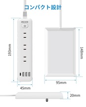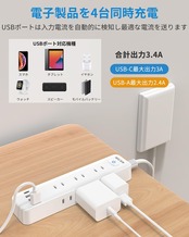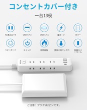一台13役・延長コード:9個AC差込口と4個usb差込口があるマルチタップです。コンセントの3面にはそれぞれ3個AC差込口があります。水平面・垂直面にプラグを挿せるたこあしコンセントです。電源延長コードの各USBポート合計3.4 A出力。USB-Aポートは最大5 V/2.4 A出力で、設備に最適な電流を流す。type-cポートは最大5 V/3 A出力で、充電がより便利です。電源タップは底がフック穴と滑り止めが付いており。延長コードがあっで、多くの場所で手軽に使用できます。