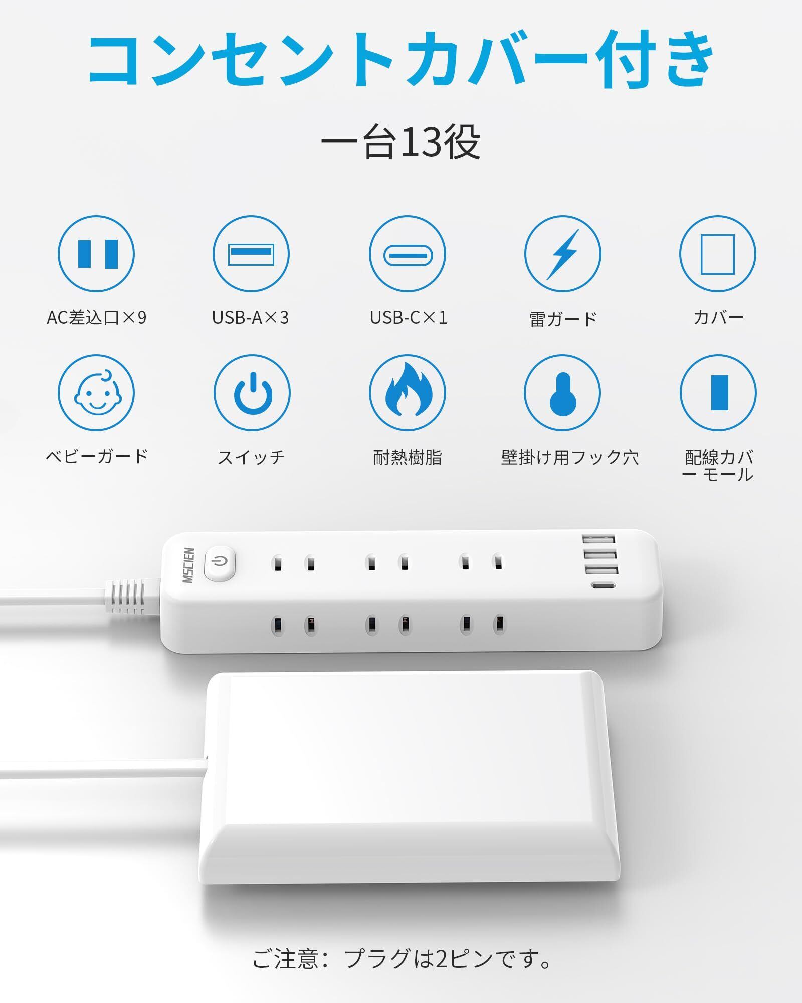 エムサインMscien コンセントカバー 赤ちゃん 電源タップ ベビーガード 延長コード2m 雷ガード 9個口 4個usb コンセント タップ たこあしコンセント テーブルタップ 壁掛け 分岐 タコ足配線 子供 コンセントガード おしゃれ