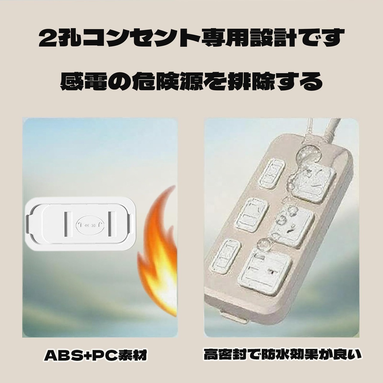 【素材】コンセントカバー は耐熱性、耐久性、高絶縁性を持つABS樹脂で作られており、安心してご使用いただけます。この素材は無味無臭で、人体に無害です。2孔コンセント専用設計です