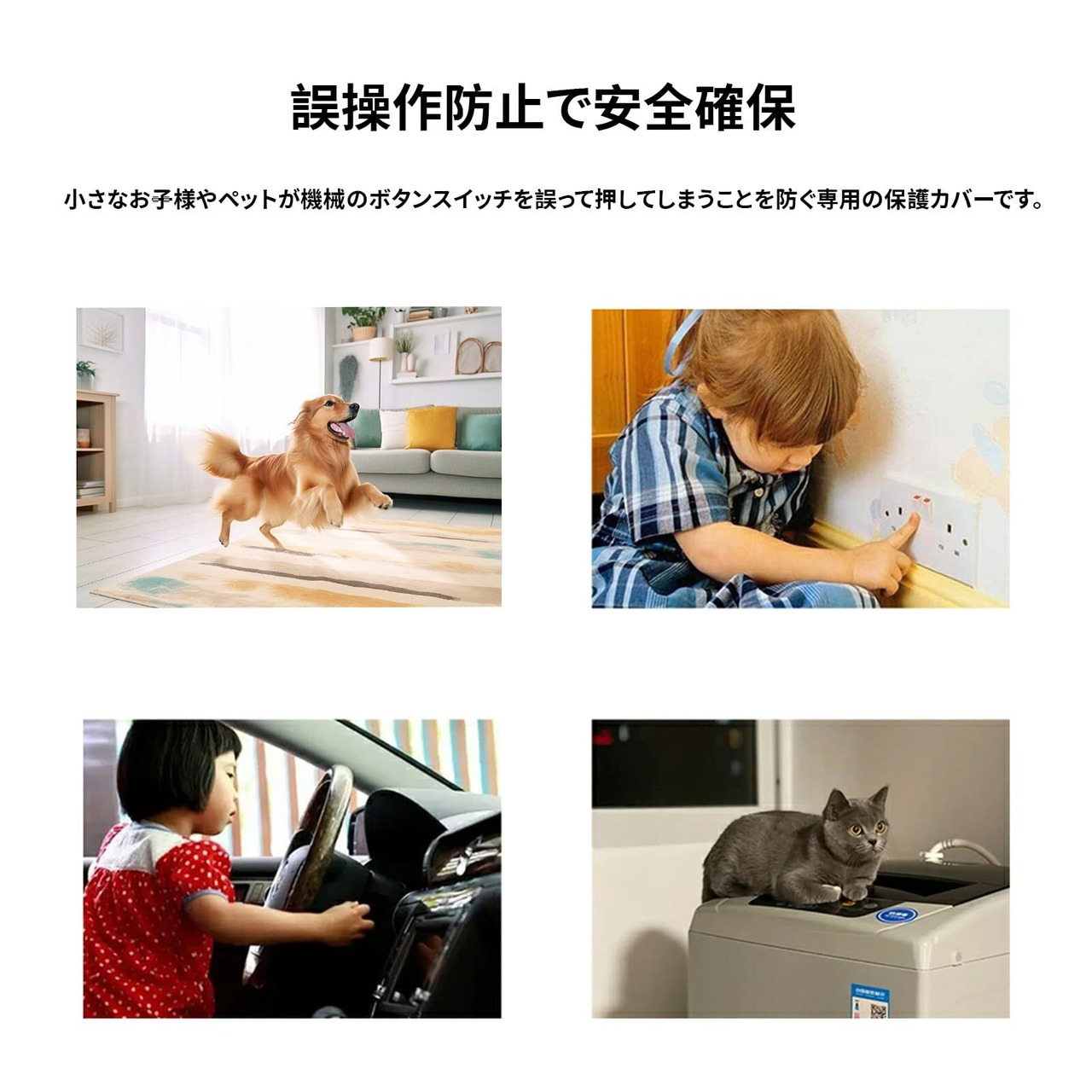 本商品は、押しボタン式スイッチを効果的に覆い、意図しない操作を防止します。洗車機や家庭用電化製品など、さまざまなシーンで安心してご使用いただけます。「※この商品に関するご質問がございましたら、お気軽にお問い合わせください。」