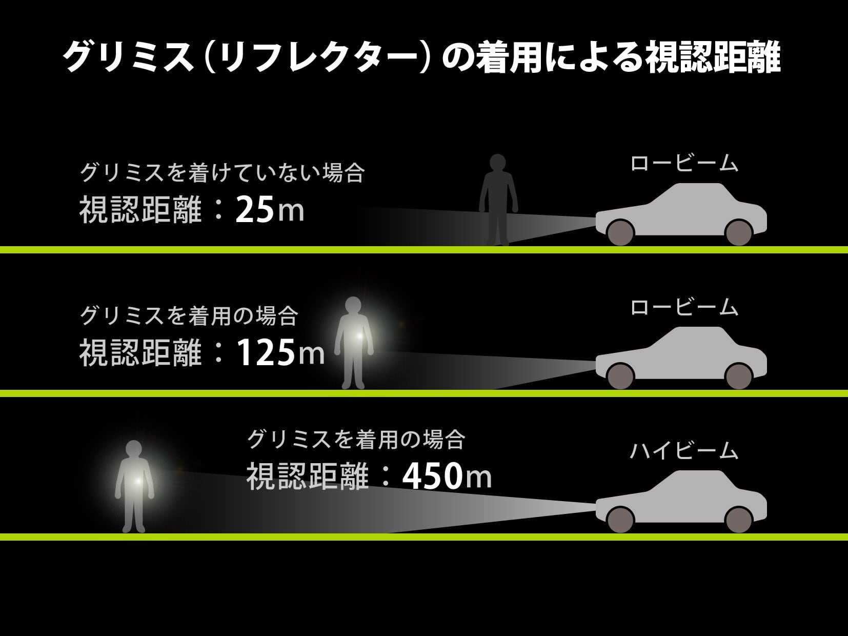 グリミスを身に付けることにより、暗闇でドライバーに的確にあなたの存在を知らせ、事故を未然に防ぎます。