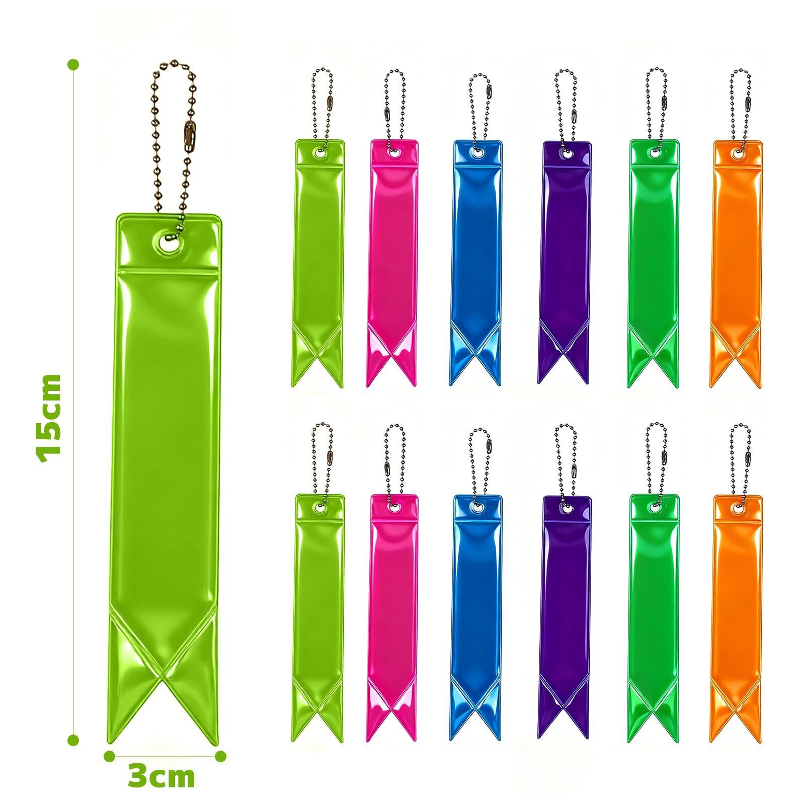 ✿【12本セット 反射 キーホルダー】キーホルダー サイズ:15*3cm。十分な数、色が豊富です。家族、子供、高齢者、ペット、通勤、通学、部活に適している。反射 キーホルダー カラー: 6種類x2本。