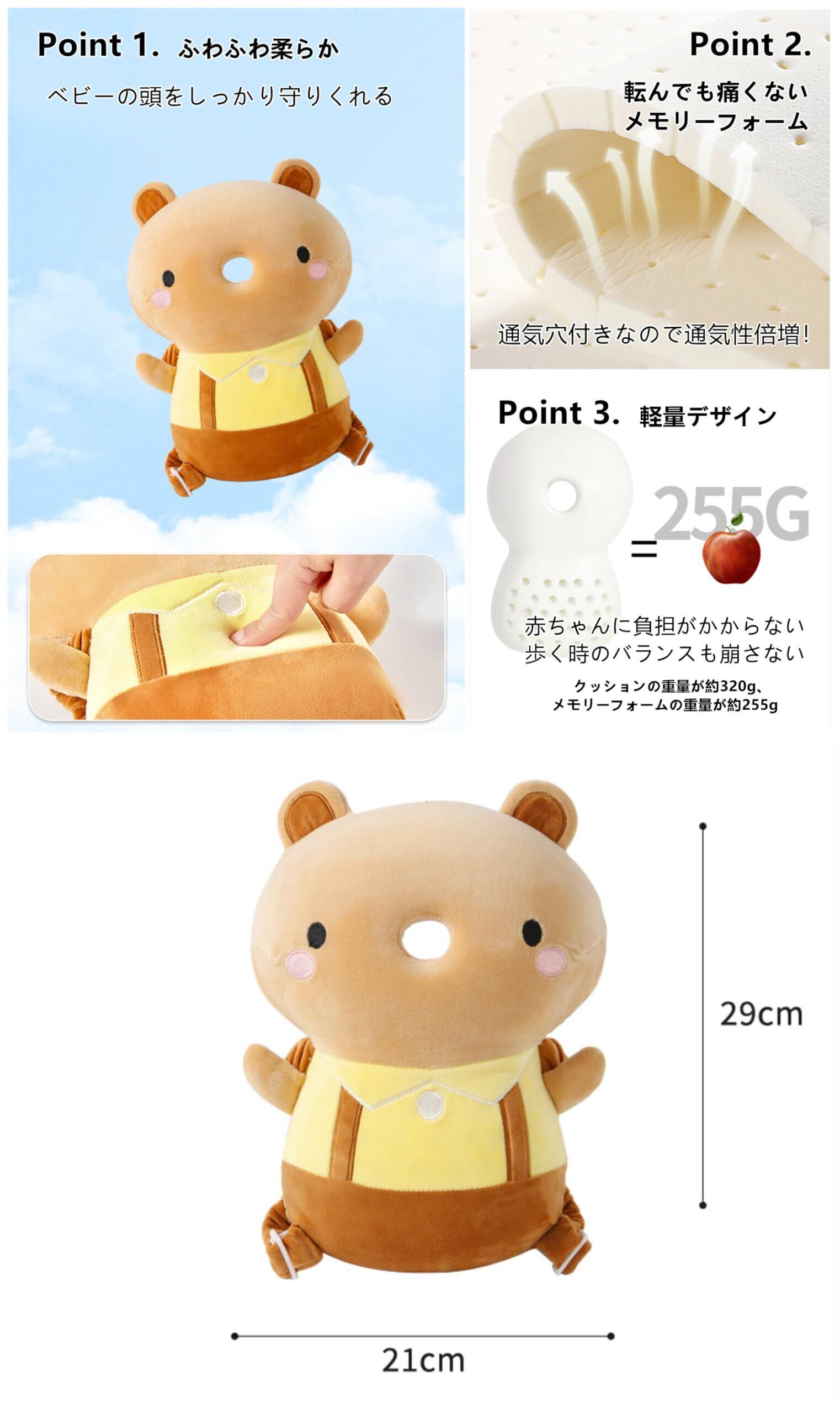 本商品は、赤ちゃんの頭部を360°しっかりと包み込み、転倒時の衝撃を軽減します。特に、側面もしっかりガードすることで、意外な角や物にぶつかる心配を軽減します。赤ちゃんの成長に寄り添い、安心して遊ばせられる環境を提供します。「※この商品に関するご質問がございましたら、お気軽にお問い合わせください。」