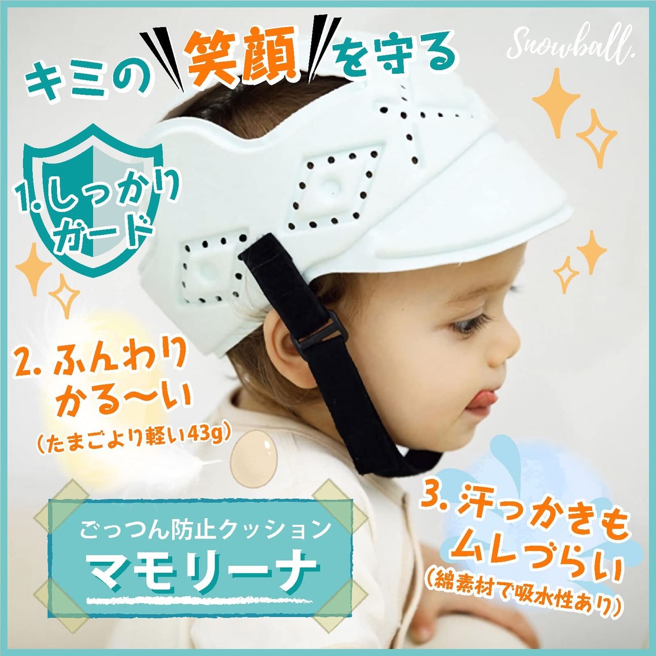 Snowball. 赤ちゃん あたまガード マモリーナ 頭ごっつん防止 ヘルメット 人気 洗える 衛生的 頭を守る サイズ調整 通気性 汗吸収 コットン100% 超軽量43g ベビーヘルメット 転倒防止 ヘッドガード
