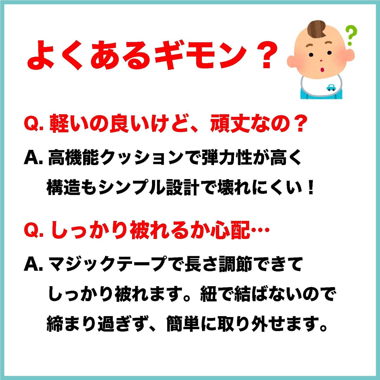このヘルメットは、赤ちゃんの頭部を360°包み込み、やさしく衝撃を吸収します。デザインは側面や後頭部もしっかりガードしており、思わぬ障害物や角にぶつかるリスクを大幅に減少させ、安心して遊べる環境を提供します。「※この商品に関するご質問がございましたら、お気軽にお問い合わせください。」