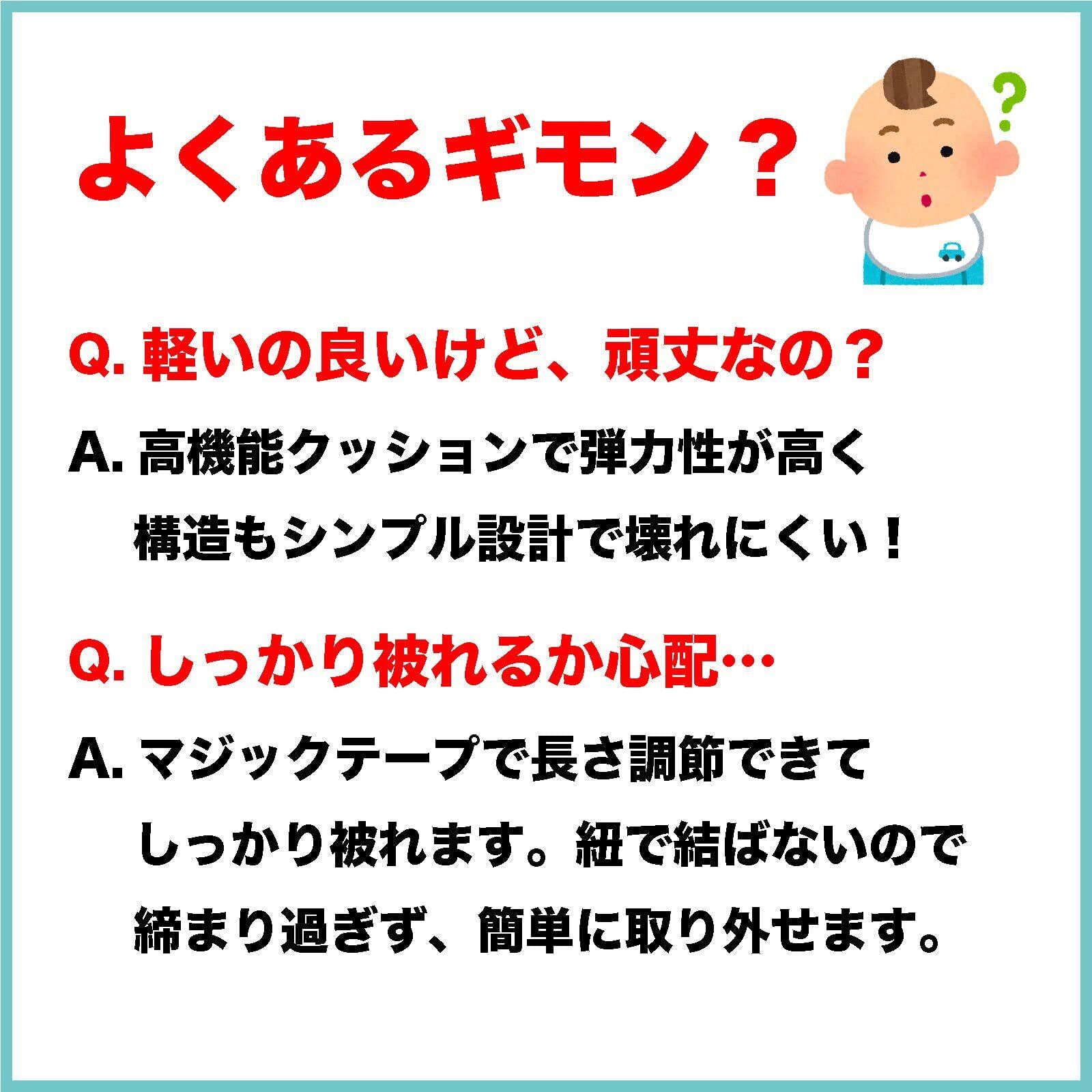 マジックテープ式のサイズ調整機能が付いており、赤ちゃんの成長に合わせてフィット感を簡単に調整できます。しっかり固定されるので、ずれ落ちる心配がなく、安全に使用できるのが特長です。