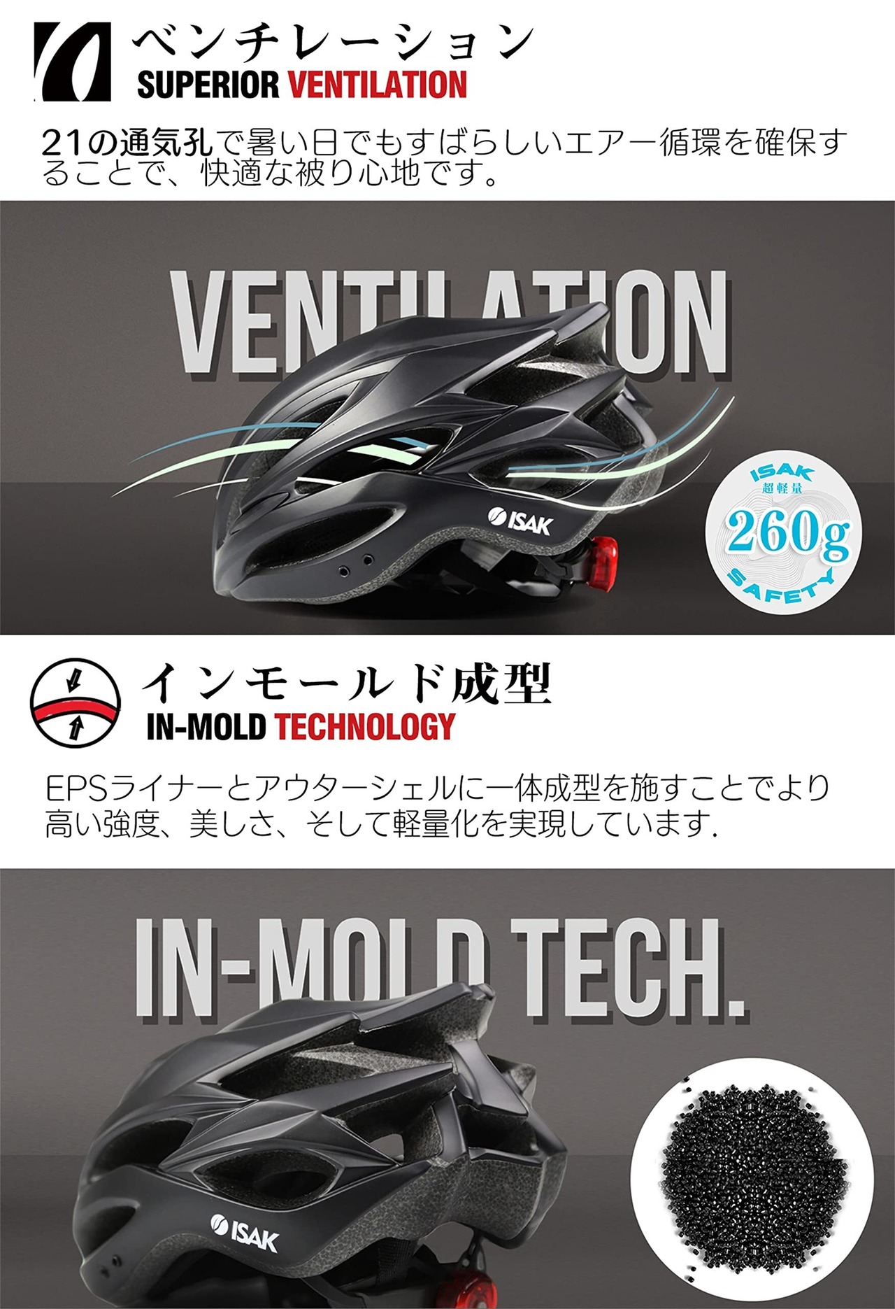 ◆耐衝撃性抜群.1.ISAKのヘルメットは一体成形技術で製造られ、完璧に融合することで、衝撃エネルギーを受ける時保護層とカバーとの分裂を避けて、使用セキュリティ性を高めます。2.ポリカーボネイト樹脂外殻、衝撃を受けた際、一次外力を分散させる役目を果たします。3.内装の衝撃吸収発泡スチロールが転倒時の衝撃を吸収することで、お客様の頭部を危険から守ります。