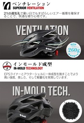 ◆気軽なシンプルデザインで。1.クラスを超えた通気性能を発揮し、22箇所のベンチレーションシステムにより、大量の空気が前面から流入し、頭部を冷却した空気はヘルメット後部より排出されます。2.帽体に多数のベンチレーションを設けることで不快な蒸れを軽減します。超軽量で疲れにくいのが魅力的なヘルメットです。