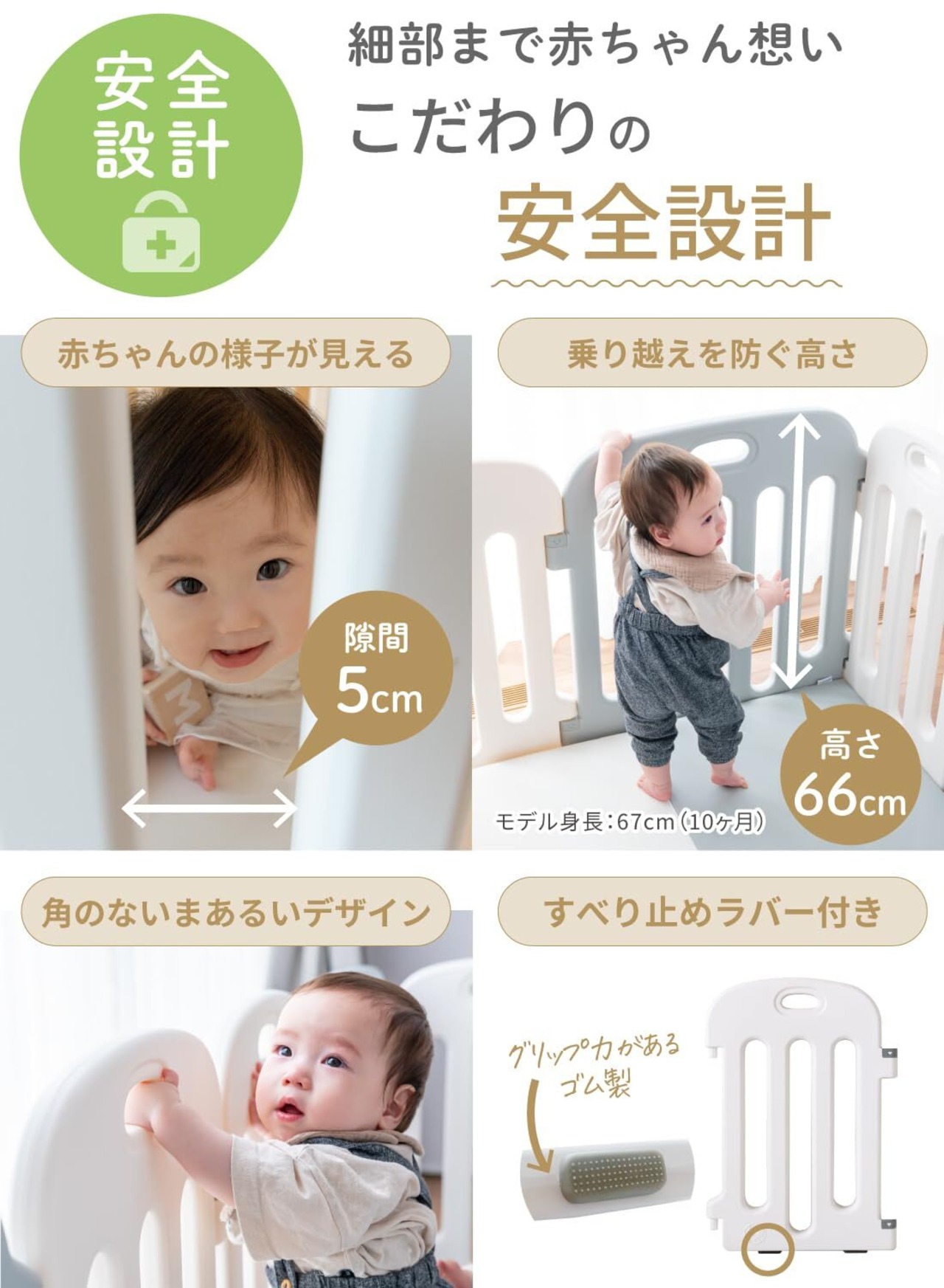 【安全な設計】家事でバタバタして少し離れているときもサークル内赤ちゃんの様子が見るようにフェンス幅は約5cmに設計しました。パネル高さは約66cmなので赤ちゃんが乗り越えれない、でもパパママは跨ぐことのできるちょうどいい高さ【外側ロック式ドア付き】サークルへの出入りがしやすいようにドアパネルも付属しています。さらに外側にはロック機能が付いているから万が一の脱走予防もできます