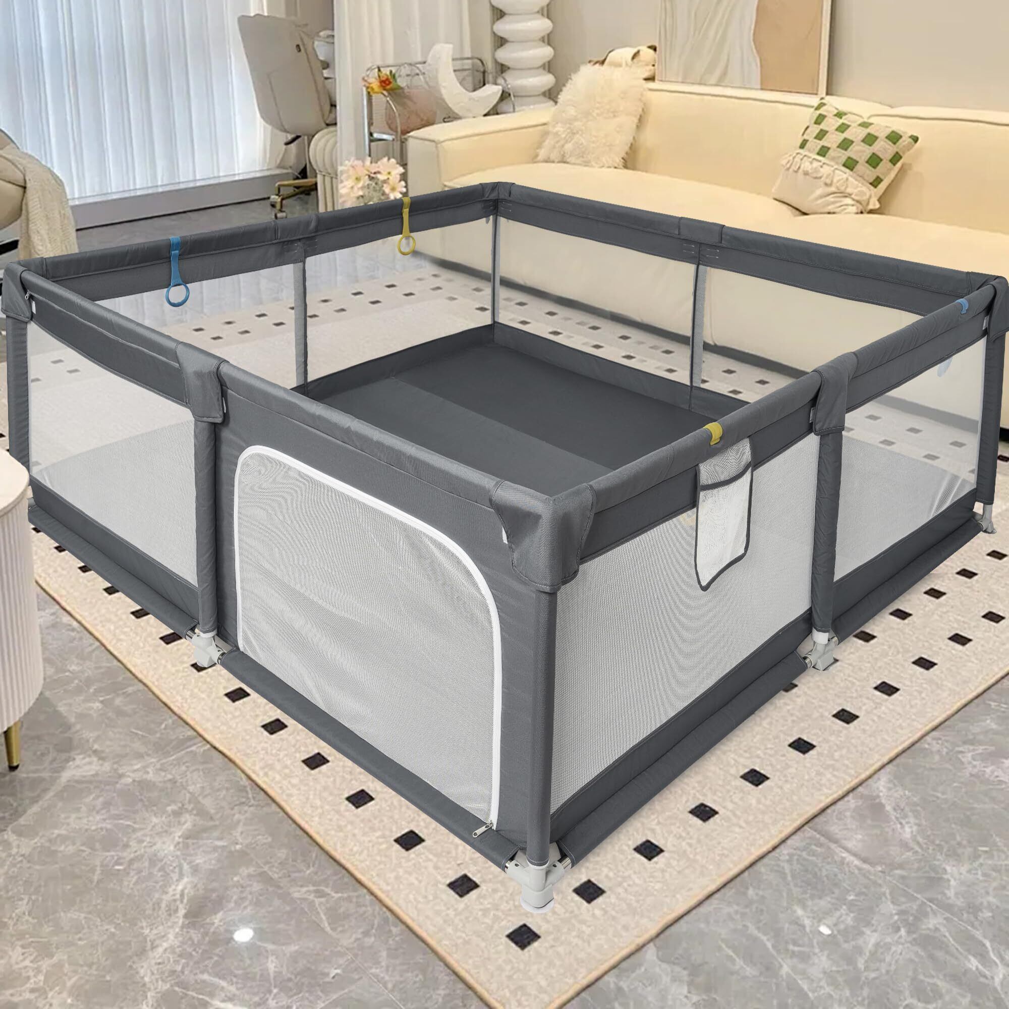 BQKOZFIN ベビーサークル サークル 赤ちゃん(200x200x66cm)正方形 コンパクト 扉付き 大型 プレイヤード baby playpen 滑り止め吸盤 メッシュタイプ 洗濯可能 収納バッグ付き 室内外対応 子供 軽量 日本語の説明書付き(ダークグレー) | yankees