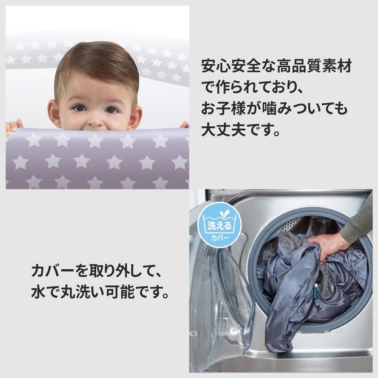 常に清潔に保てるよう、メッシュ素材は洗濯機でのお手入れが可能です。子供のおもちゃや周辺環境が清潔であることは、ママにとって嬉しいポイントです。