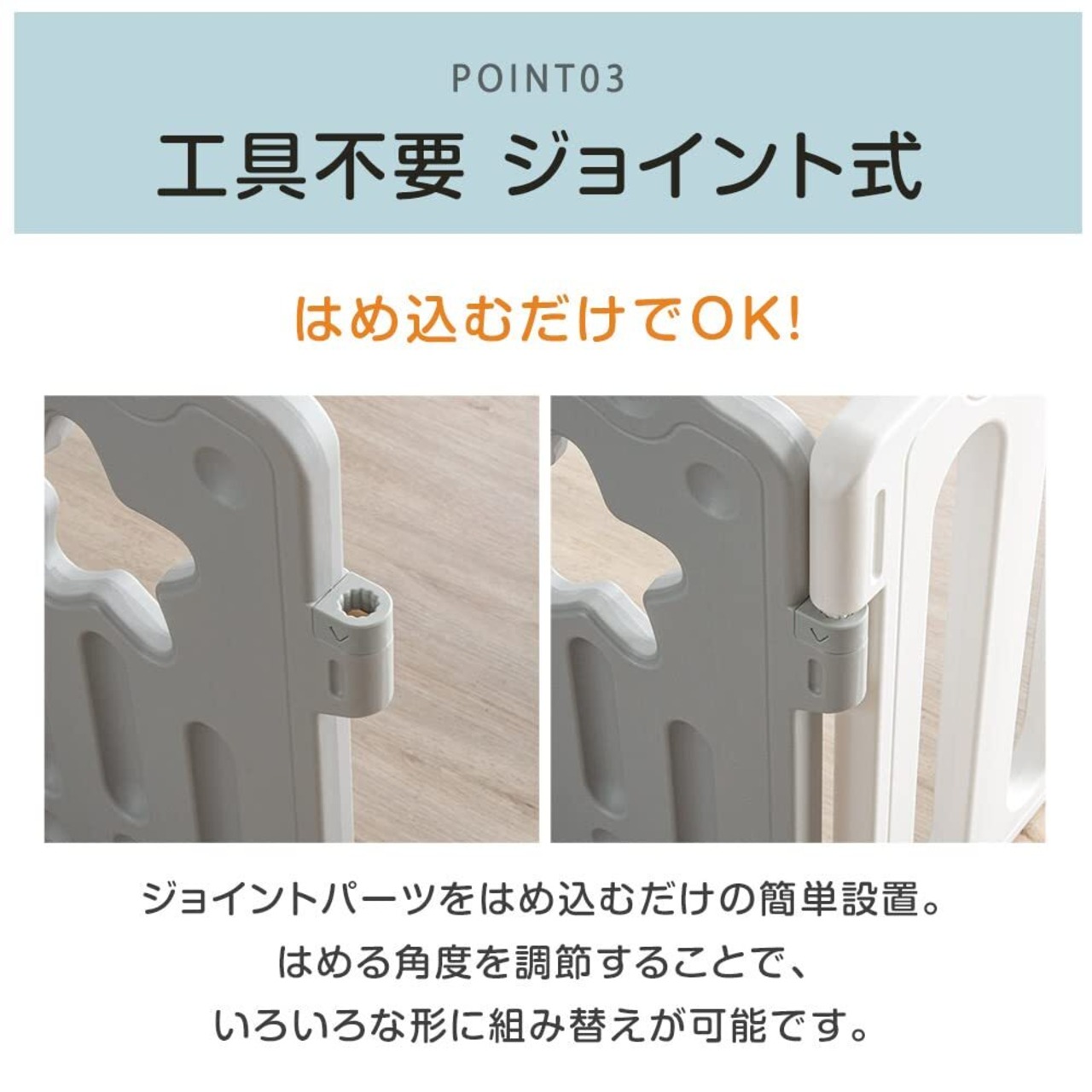 このベビーサークルは、15枚のジョイント式パネルで構成されており、工具なしで簡単に組み立て可能。忙しいママやパパにも嬉しい時短アイテムです。「※この商品に関するご質問がございましたら、お気軽にお問い合わせください。」