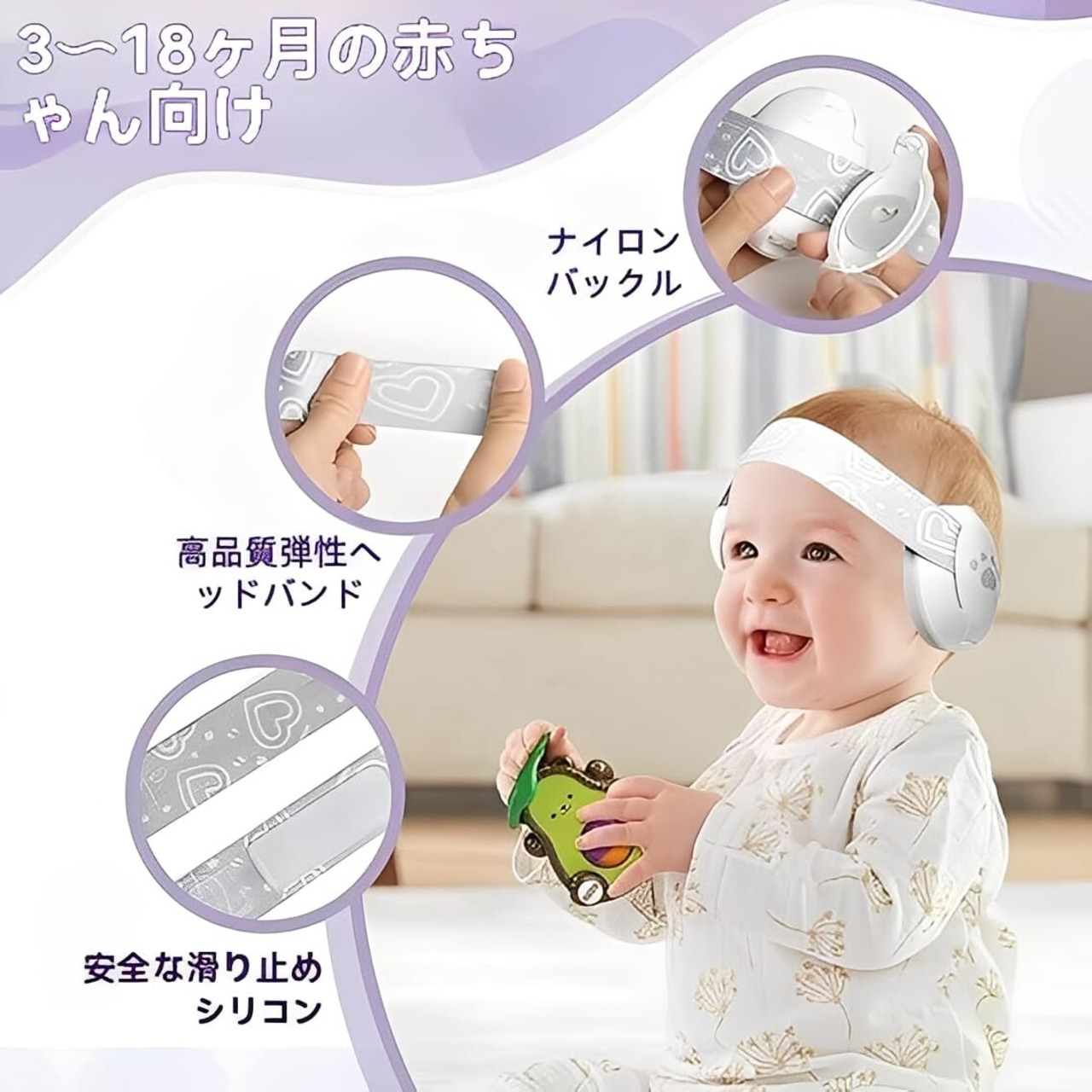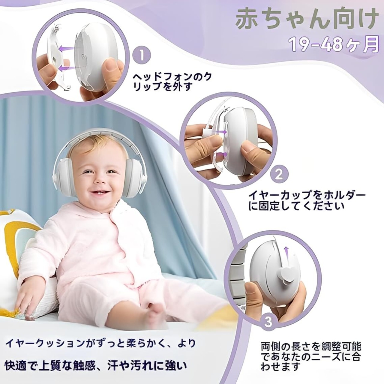 軽量設計を採用しているため、お子様が長時間つけても疲れにくい仕様です。頭にフィットするヘッドバンドは調整可能で、1ヶ月から48ヶ月のお子様まで幅広く対応します。敏感な肌にも優しく、心地良い装着感を実現しています。