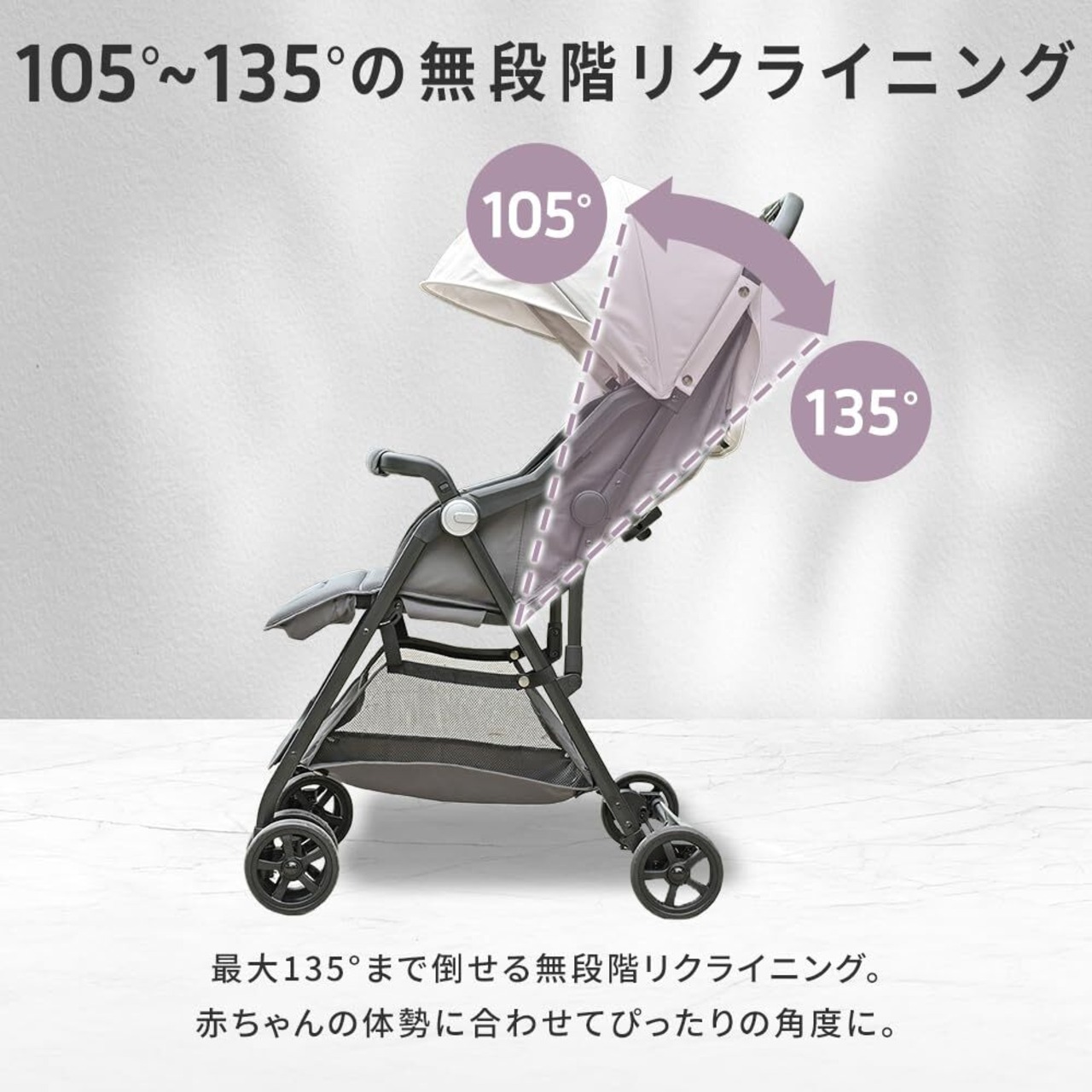 無段階でリクライニングできるため、お子様の成長や眠りに合わせて快適なポジションを提供します。お昼寝中でも安心してお出かけできます。