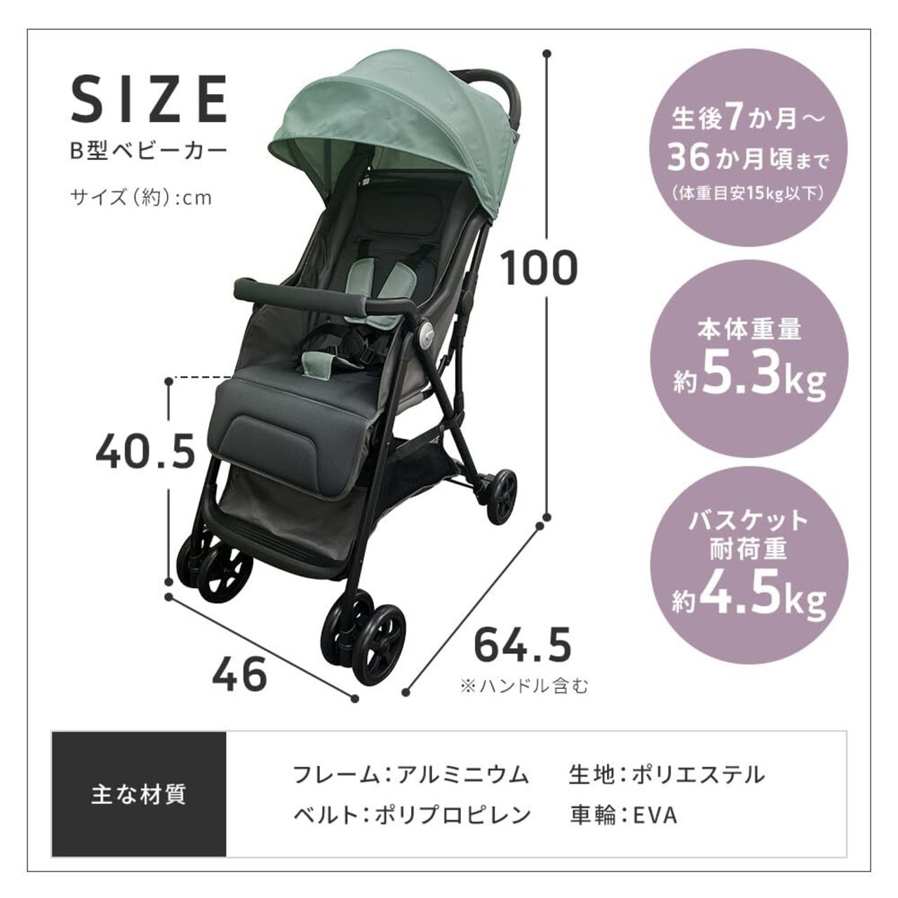 ・特長:折りたたみ機能、自立機能、5点式シートベルト、無段階リクライニング、バスケット付き