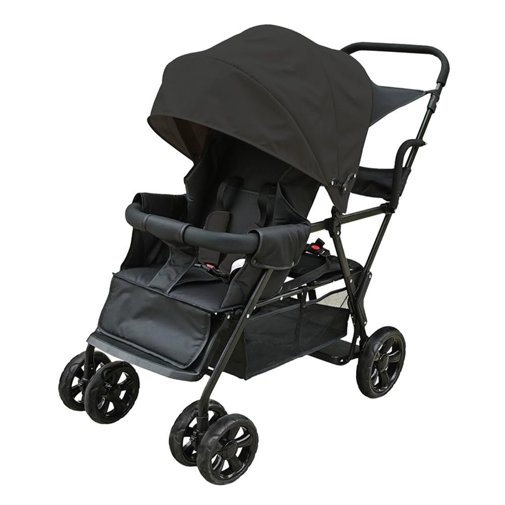 パパママが長時間抱っこしなくても、これ1台でおでかけできるベビーカーです。兄弟・姉妹で仲良くお出かけ 後席のお子様は座っても立ってもOK!