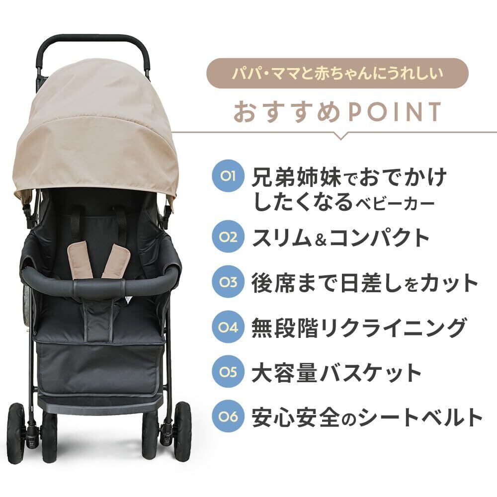 ・特長:2人乗り、スリムな設計、大型日よけ、広々とした座席、大容量収納カゴ