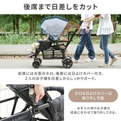 後席まで日差しをカット! 前席には大型のホロ、後席には日よけカバー付き。2人のお子様を日差しからしっかりガードします。