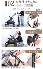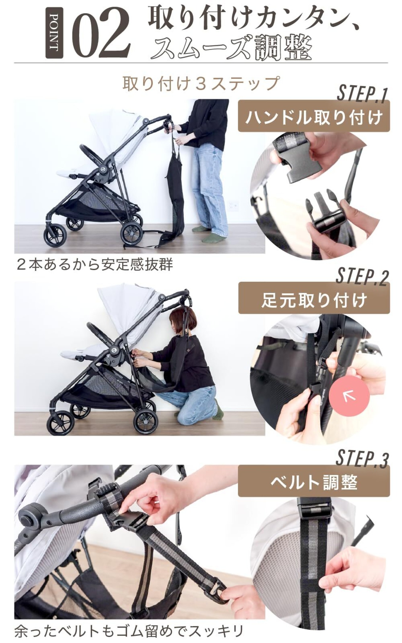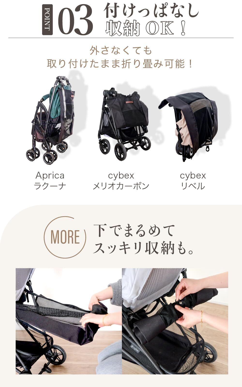 【対応機種】A型ベビーカー、B型ベビーカー ※但し、対面式及び2人乗りベビーカーは、以下制限ありのため対象外。【注意事項】1. 対面式でのご利用の場合は、荷物がお子様の足に当たってしまうため、お勧めいたしません。 2. ベビーカー標準で下部に大容量のカゴが装着されている場合、モックルンの荷物スペースと干渉する可能性があります。 3. 2人乗りベビーカーの場合、取り付けられない可能性があります。足元ベルトを設置する箇所のフレーム幅が55cm以下であれば取付が可能です。